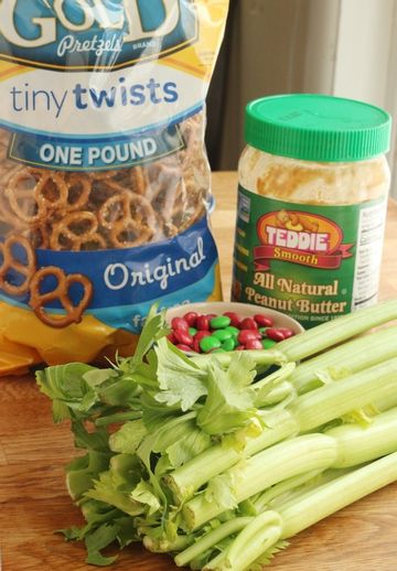 Scrub celery and cut long stalks in half. Spread peanut butter in groove in stalk. Stick on candies and pretzels. Enjoy!