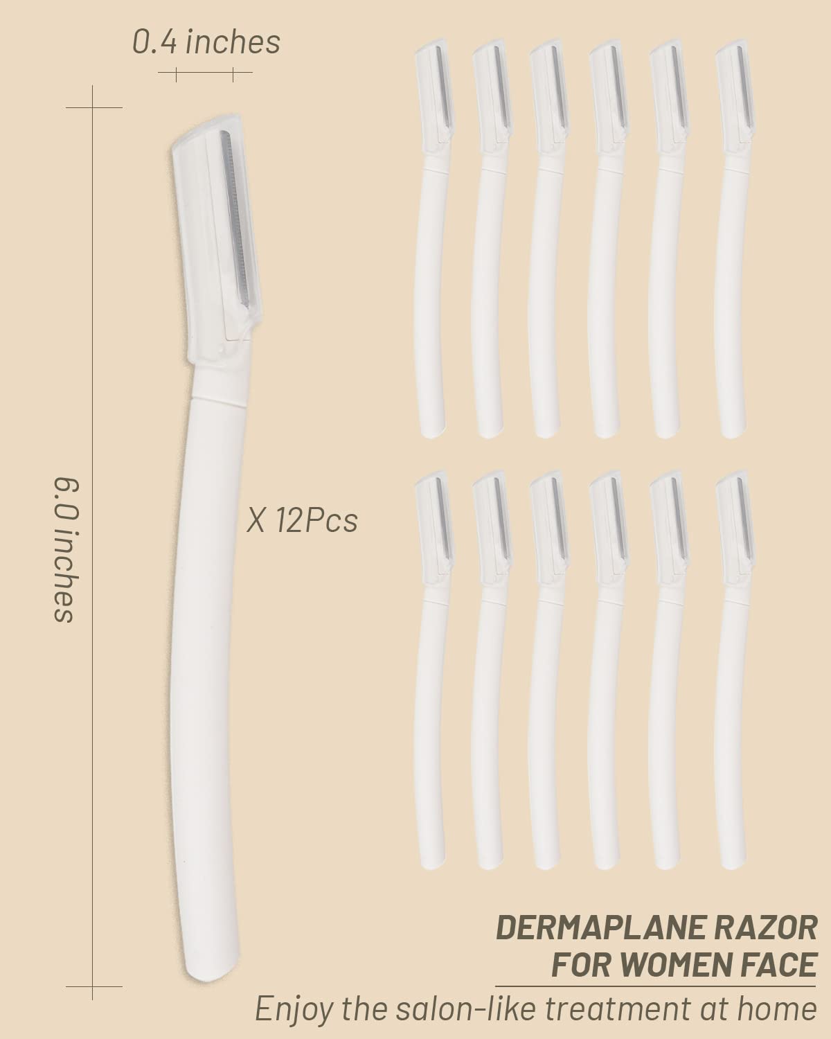 DERMAPLANE RAZOR 12PCS SAY HELLO TO FINE SKIN DELICATE AND SMOOTH HIGH-QUALITY AND SAFE BLADES Product Advantages: Removable Microbrade Exquisite Frosted Texture Smooth Handle Premium Materials Protective Cover Transparent cover for easy cleaning Keep you safe when not using the eyebrow razor Micro-hole Spacing: the dermaplaning blade has a 0.5mm hole and a 0.1mm hole spacing, and the guard mesh is more rounded and delicate. As a result, they are safe and efficient to use, suitable for sensitive skin and beginners. Salon Like Service: our facial razors for women face are made of high quality materials from the handle to the blade which great for exfoliating the skin, so you can use them at home conveniently and enjoy salon like. Exquisite Frosted Texture: With the elegant creamy white color tone and bright frosted surface, the whole facial razor looks exquisite and is undoubtedly the best gift you can give to your friends, relatives and partners. Package Contents: There are 12 Pcs of face shavers for women and men in our package. Longer face razor (6.0in) is for larger areas of hair removal, shorter face razor (5.1in) is or more precise repairs. Each eyebrow shaver is equipped with a precise protective cover, to protect the eyebrow razors when face hair removal for women is not in use. Whether you want to shape face fine hairs or other unnecessary hairs, our shaver for women razor is a great choice for you. Product Aplication: Multipurpose Whether it is eyebrows, lip hair, forehead as well as small facial lint and other peach fuzz, they can be perfectly shaved off by our dermaplane razor for women face. Notes: Our dermaplaning tool set has 12 lightweight cutters for your use. Please do not leave them lying around when not in use. Please use the dermaplane razor women face carefully and keep them away from children. When the face razors are not in work, please cover blade with the protective cover.