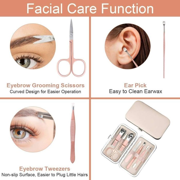 Product Description: [Faical&Hand&Foot Care Tools] Manicure set contains 7 tools(large nail clippers, small oblique nail clippers, eyebrow scissors, eyebrow tweezer, ear pick, nail file, nail cleaner),which can meet your personal care needs.High quality manicuer kit and nail grooming kit for men, boys, teenagers, seniors, women and girls. [High Quality] Our Nail clipper blade edge has been sharpened twice which is sharp and durable.Nail clipper handle with non-slip ripple texture lever.Each tool is manufactured by the careful process of cutting to make sure it can be used more comfortably. [Portable&Ideal Gift] Small size and light weight make it convenient to carry, great for travel and daily life! It is very practical, it is a great gift for yourself, your families and friends. Features: A great combination nail clipper set, 7pcs of different care tools are included, meeting all your basic need for hand care, facial care and foot care. Our manicure set all the tools are made of top grade stainless steel which will never rust, extremely sturdy and durable, can be used for a long time. A PU storage case is included, stylish and elegant, nice for keeping all your tools organized, you would not lost the nail clipper and other tools any more ,easy for you to get them for use and storage Portable mini size and just 0.3lbs weight , you can carry this light manicure set to anywhere. Have item for daily use or travel use, also a great gift choice for your family, friends or colleagues. A professional and multi-functional tool kit that worth buying, you will find it truly helpful and effective. ❤【New Upgraded Pink Colors Nail Clippers】Aceoce manicure pedicure sets are made of high quality stainless steel and never rust, beautiful, sharp, sturdy, durable, portable, comfortable, healthy and reliable beauty tools to protect your health. Manicure set pedicure manicure kit professional nail clippers for men