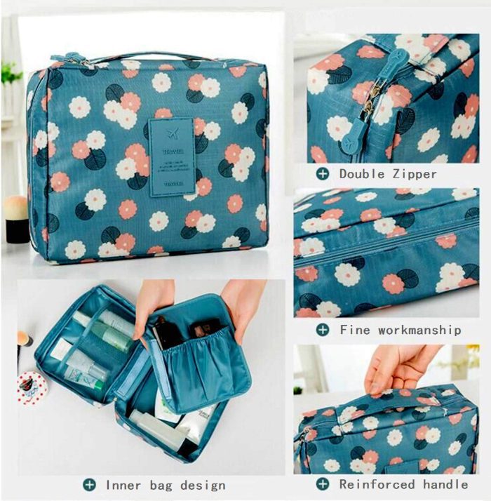 The cosmetic bag is Multifunctional and has Thick fabric. It is very durable, you can use it for a long time.; The polyester blue travel organizer measures 24 x 19 x 8 CM (LxHxW) in height. Upper Grid Design & Removable Baffles. Made of waterproof fabric.