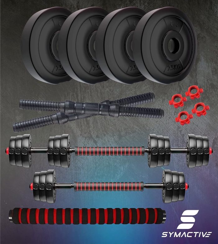 In-box Contents: 10 kg of PVC weights (2.5 kg x 4 = 10 kg), 14” Dumbbell Rods Pair & Nuts, 1 Cushioned Connector Rod,2 x 14-inch dumbbell rods with nuts and one connector rodTRUE,The home gym set is a perfect muscle builder. It will be your go-to strength-bulding equipment to allow you to achieve your fitness goals. The gym set helps build muscle power, improve their strength and burn excess fat.,This is suitable for all types of customers – beginner level to advanced workout enthusiasts and can be used by men & women alike.The entire set of weights & strength equipment is made in India..