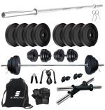 16 kg of PVC weight (2 kg x 8 = 16 kg),1 x 4 feet plain rod (shoulder/ bicep) + 2 x 14 inch dumbbell rods,100 percent percent leather gym gloves + 1 Gym backpack + 1 Skipping Rope + 1 Hand Gripper + 2 locks and clippers comes with the rodsTRUE,The home gym set is a perfect muscle builder. It will be your go-to strength-bulding equipment to allow you to achieve your fitness goals. The gym set helps build muscle power, improve their strength and burn excess fat.,This is suitable for all types of customers – beginner level to advanced workout enthusiasts and can be used by men & women alike.The entire set of weights & strength equipment is made in India..
