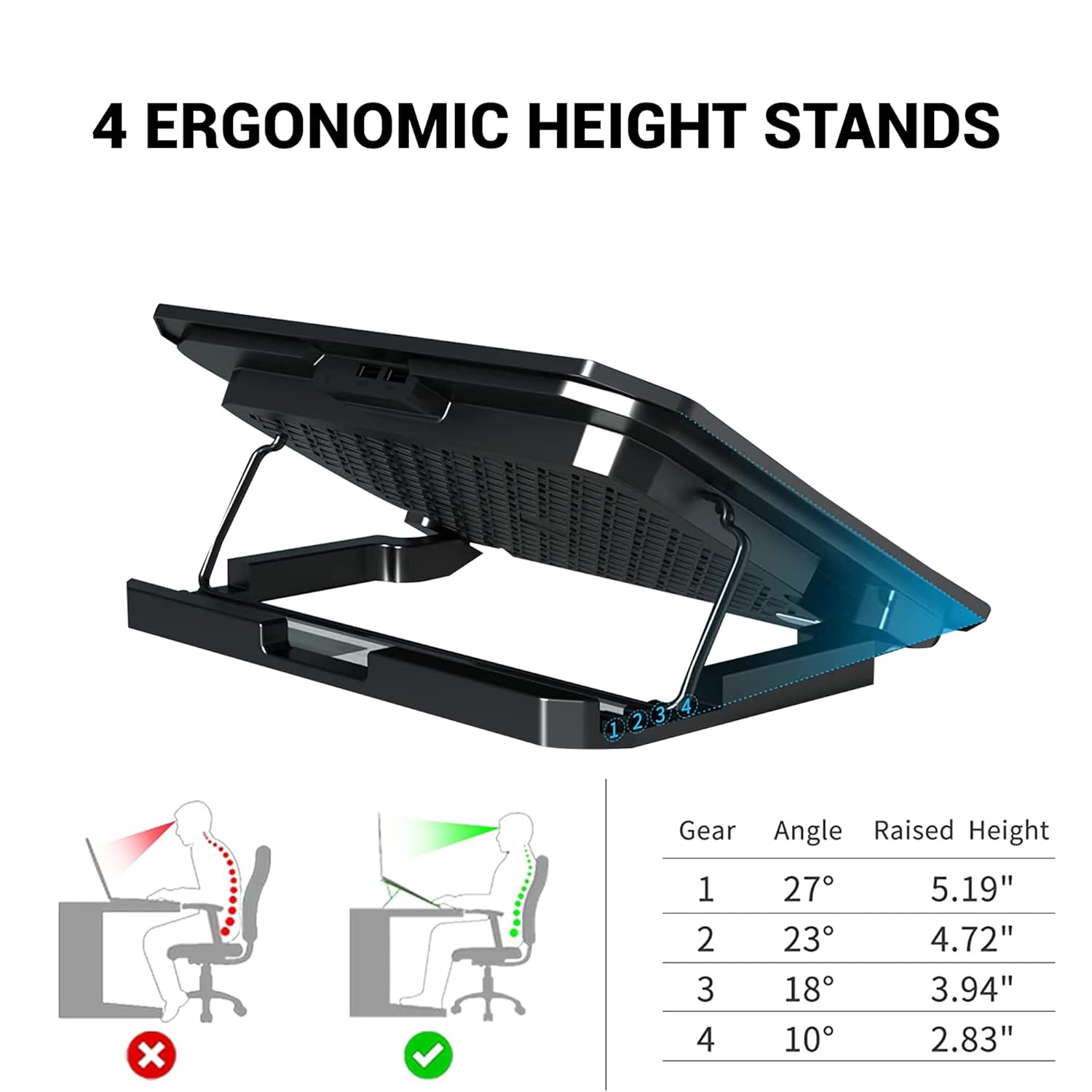 ERGONOMIC HEIGHT STANDS: The laptop cooling stand has 4 different heights and angles for you to choose from, raising your laptop 2.83″-5.19″, angles 10-27 degrees, providing you a very comfortable and healthy posture
