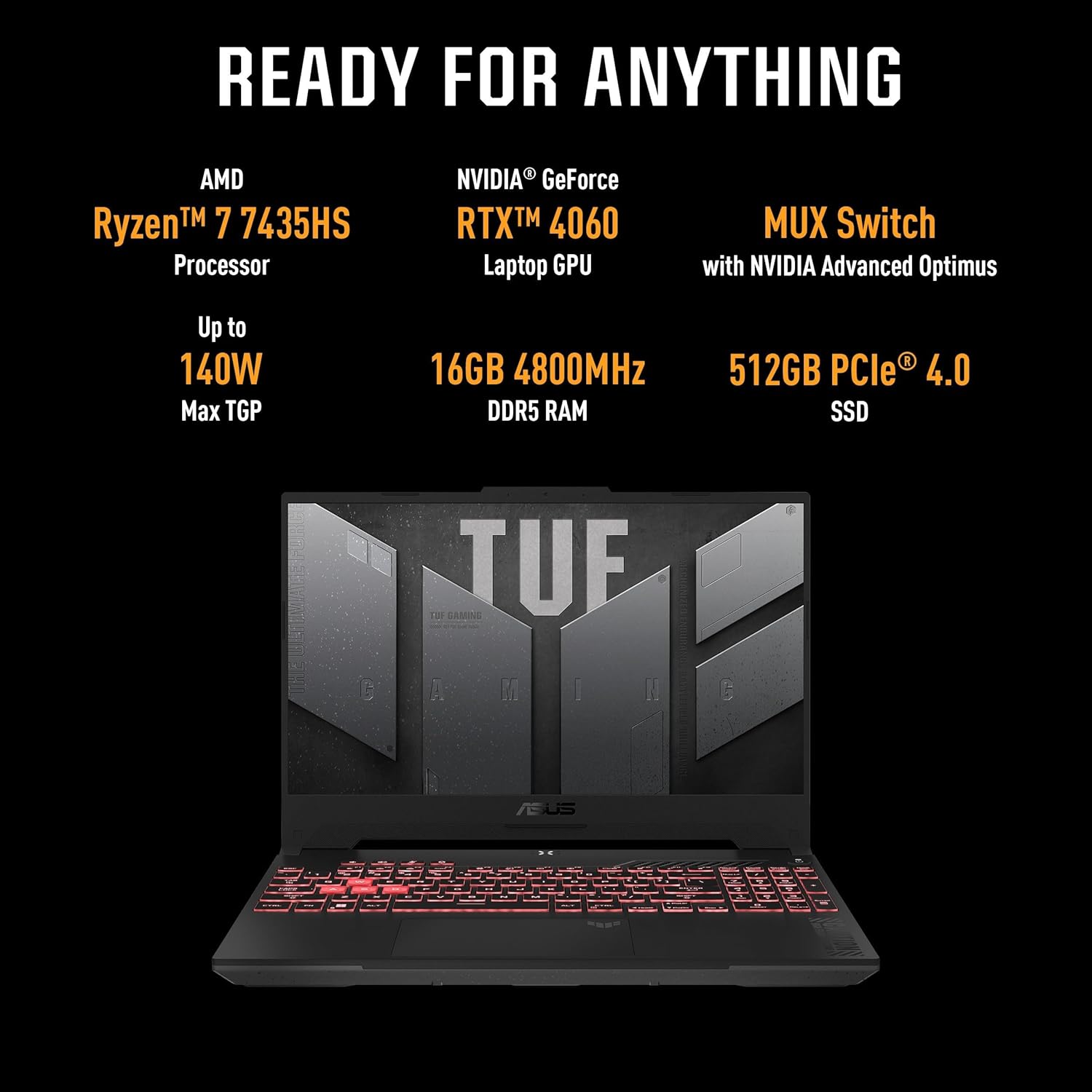 ASUS TUF Gaming A15, 15.6″ FHD 16:9, 144Hz 250nits, AMD Ryzen 7 7435HS Mobile Processor, Gaming Laptop (16GB RAM/512GB SSD/RTX 4060/Win 11/Office Home/90WHr Battery/Mecha Gray/2.2 Kg),FA507NVR-LP104WS