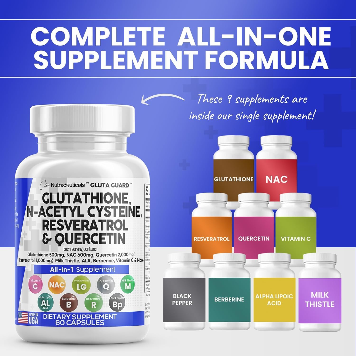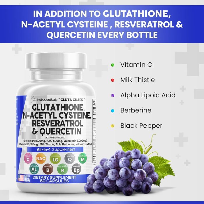 Comprehensive Resveratrol Supplement Formula – Our Glutaguard blend features Berberine 1000mg, N-acetyl-l-cysteine, and Milk Thistle 1000mg, working in synergy to deliver comprehensive health benefits. From supporting liver health to boosting antioxidant levels, this is a supplement for the health-conscious individual.