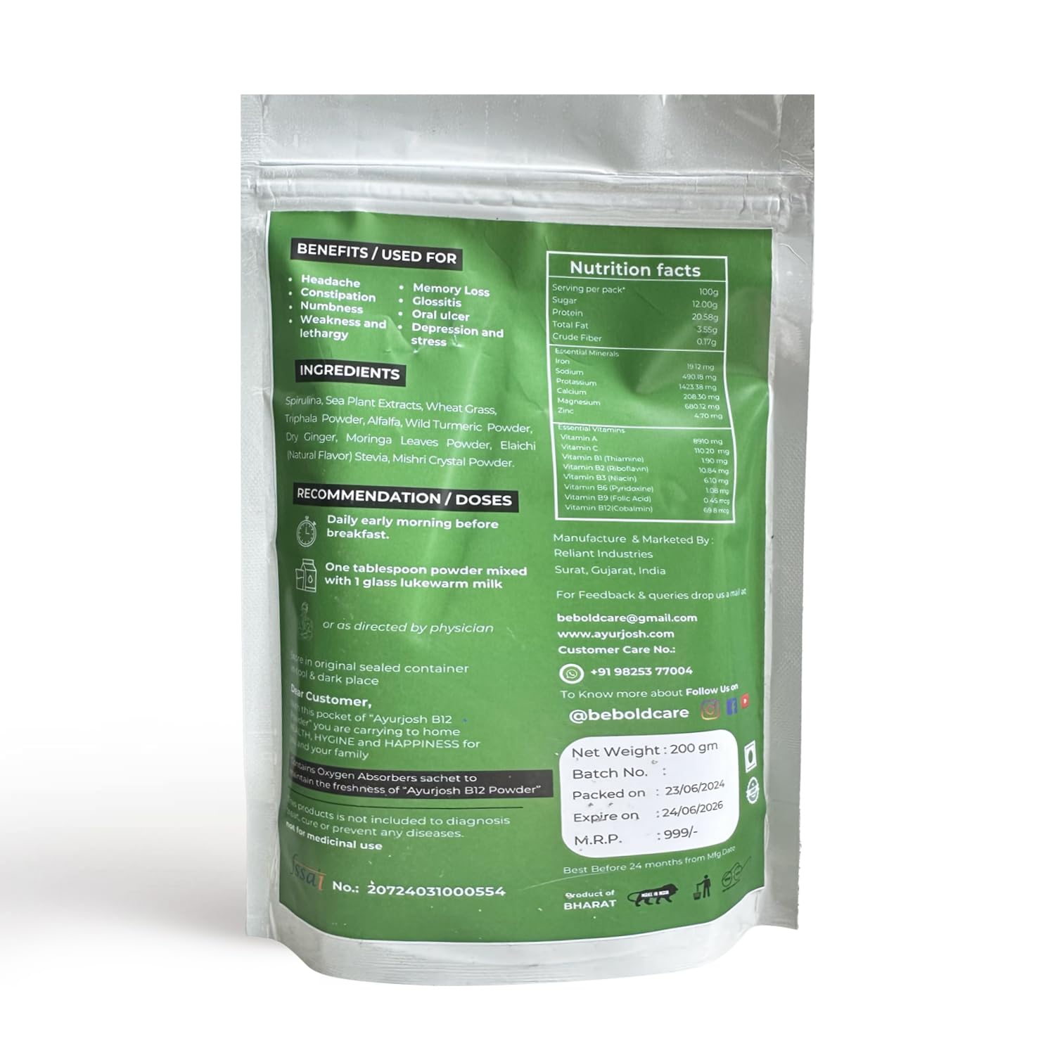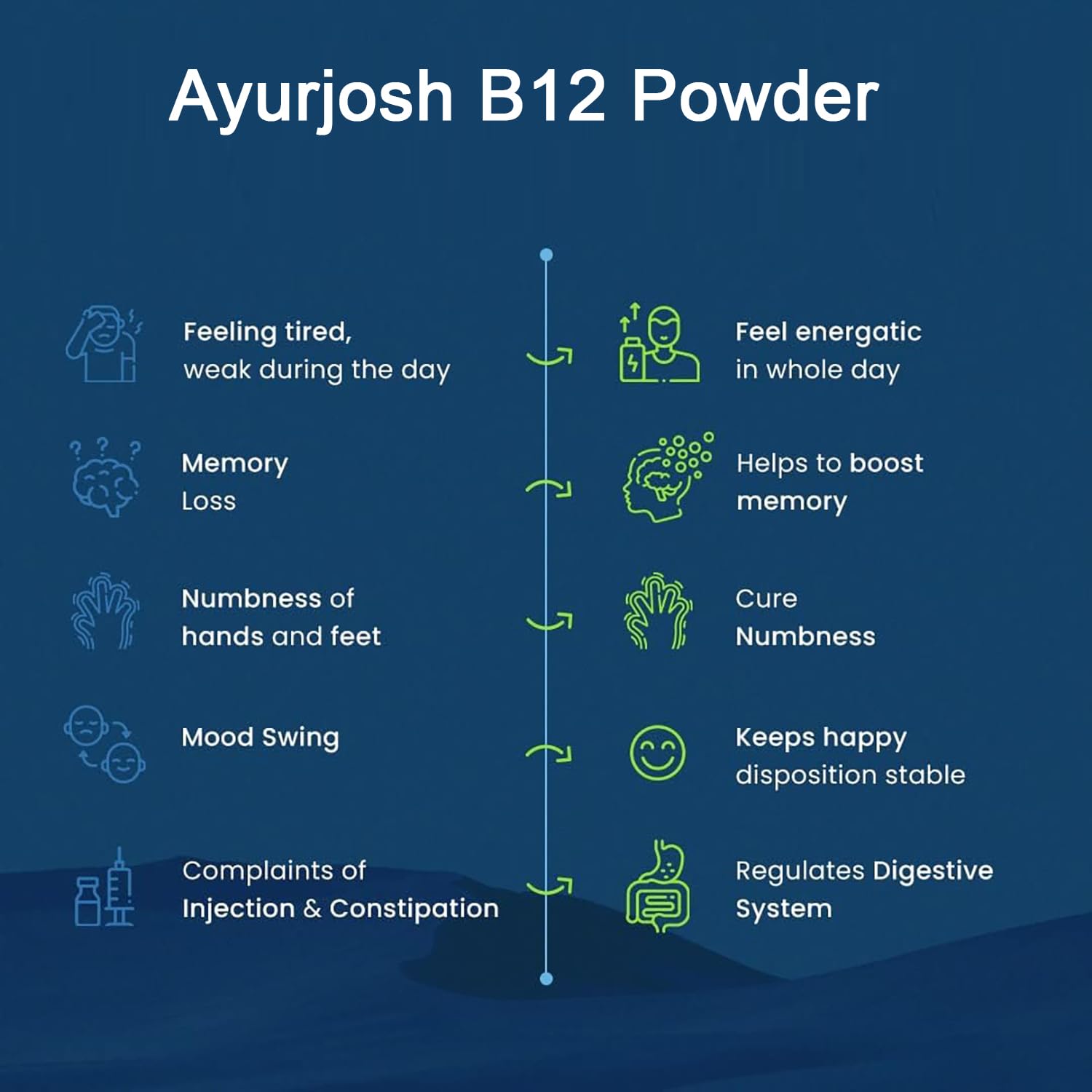 Introducing B12 Ayurjosh Powder, a premium blend crafted with care to support your well-being. This fine powder is made from carefully selected ingredients, aiming to provide a natural source of Vitamin B12.B12 Ayurjosh Powder is designed to be a convenient addition to your daily routine. The powder can be easily mixed into your favorite beverages, such as smoothies, juices, or even water, allowing for seamless integration into your lifestyle. Its gentle formulation ensures that it blends smoothly without altering the taste of your drinks.Housed in a secure, resealable package, B12 Ayurjosh Powder maintains its freshness and potency. Each serving offers a precise amount, ensuring consistency and ease of use.
