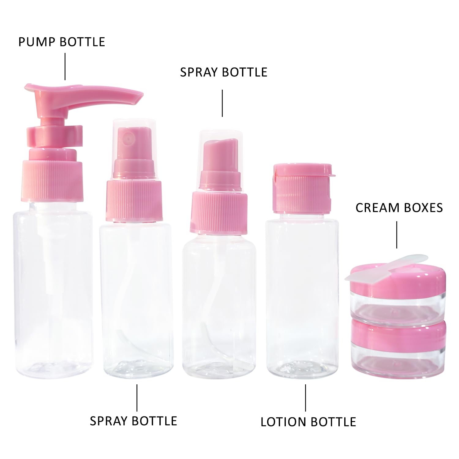 Comprehensive Set: Includes 7 essential travel-sized containers – spray bottles, pump bottle, liquid bottle, cap pet jars, and a spatula, all in a convenient zipper pouch.