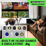 Upgrated -Smart Game Chip: wireless TV game console built-in more than 10000 Games,more than 9 Emulators are installed , and a 64GBTF card is attached which support you to game search functions, and can save/read game records.Use upgraded game chips to support 8-bit, 16-bit, 32-bit, 64-bit, 128-bit emulators. It perfectly meets your needs for image quality and game fluency.
