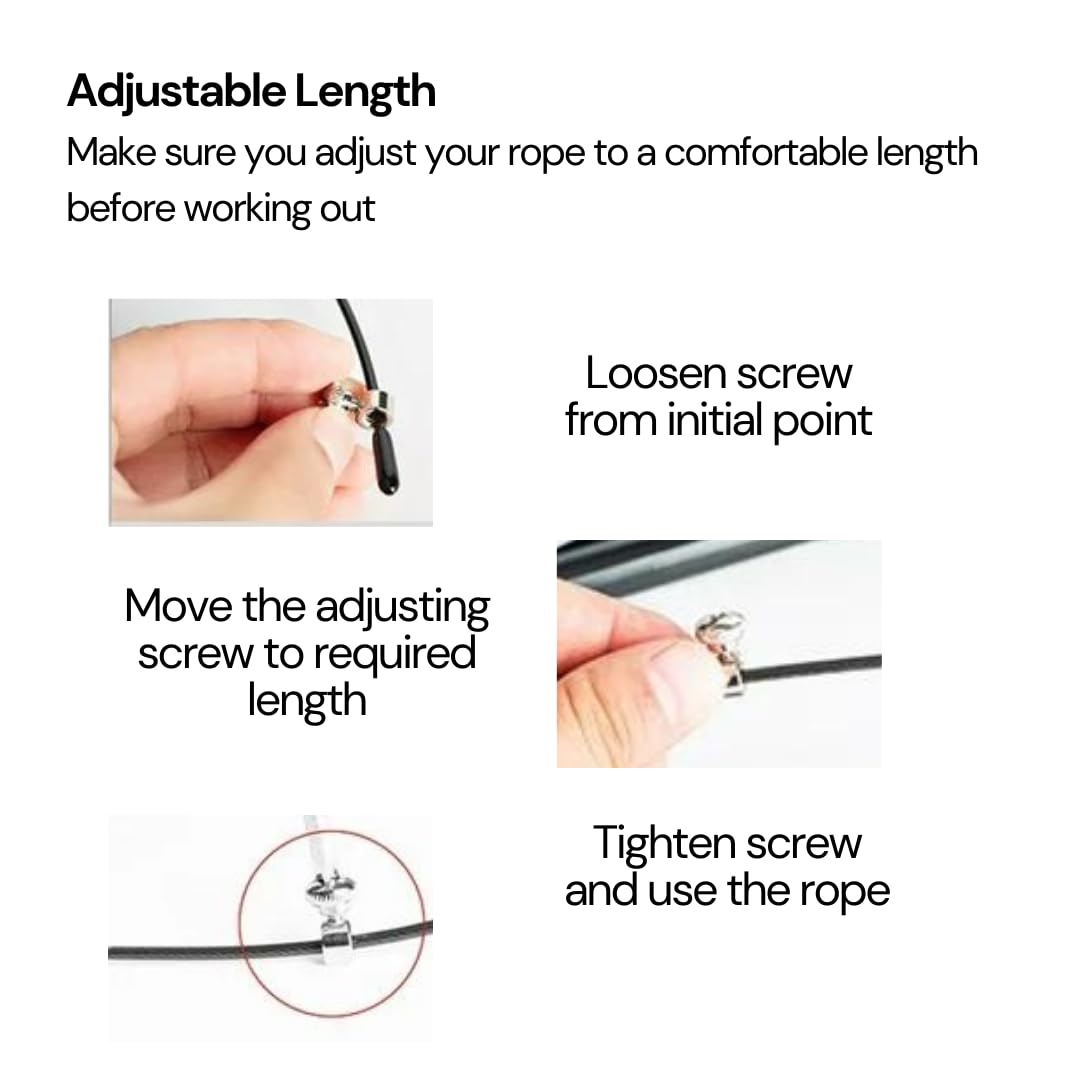 ADJUSTABLE LENGTH: Please see the images in listing to understand length adjustment mechanism. The length of rope skipping is 9.8 feet. You can adjust it to your desired length easily. Cut off the extra cord after adjusting the cord with the adjustable screw and collar system