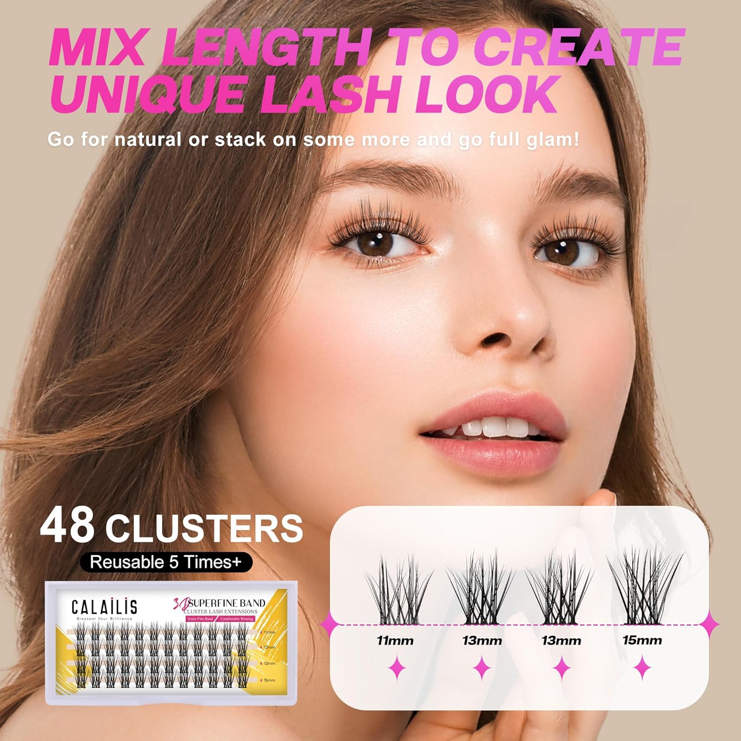 【COST-EFFECTIVE AND REUSABLE CLUSTER LASHES】Each package contain 48 cluster lashes in varying lengths, providing you with an abundance of options. CALAILIS cluster lashes can be reused up to 10 times, making them a cost-effective choice for long-lasting beauty. Master the art of applying, removing, and caring for individual lashes to maximize their potential. Unleash your inner glamour and enjoy the transformative power of DIY eyelash extensions!