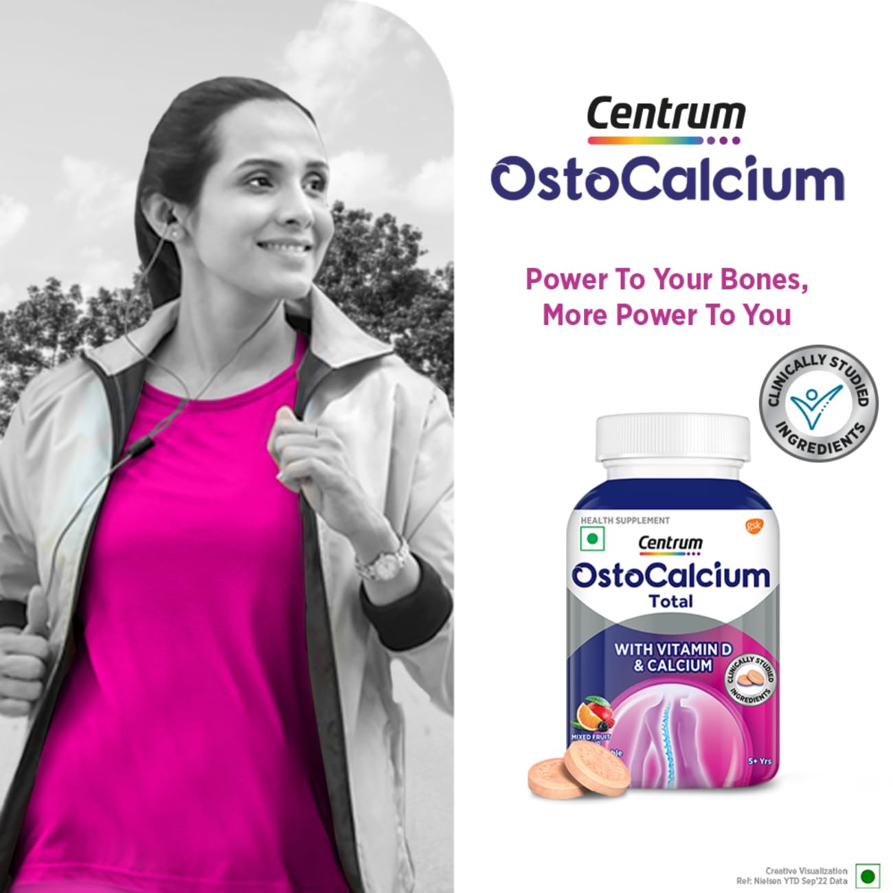 100% OF DAILY CALCIUM & VITAMIN D REQUIREMENT IN TASTY CHEWABLE TABLETS : Two tablets of Centrum OstoCalcium Total has 100% RDA of Calcium~ & Vitamin D* in tasty chewable format that can be consumed on the go. (*For 13+ Years)