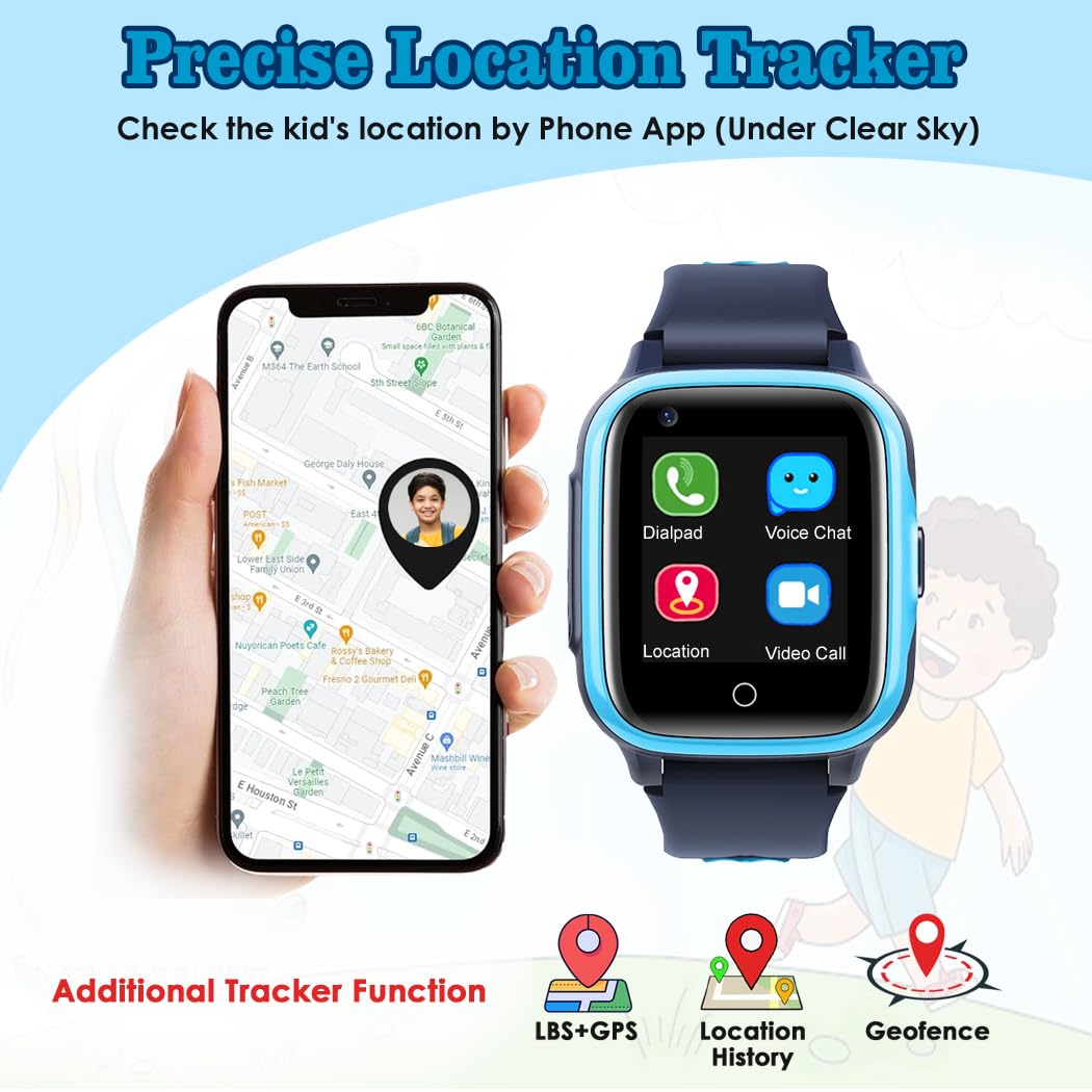 [Location Tracker (GPS+LBS)]: The kids watch has a built-in GPS positioning device. Parents can check the kid’s location by tapping on the app that matches the watch for kids with their mobile phone, and keep abreast of the kid’s location information. Note: GPS location deviation is about 5m(16ft)-200m(656ft) in outdoor space. During indoors it will show LBS position.
