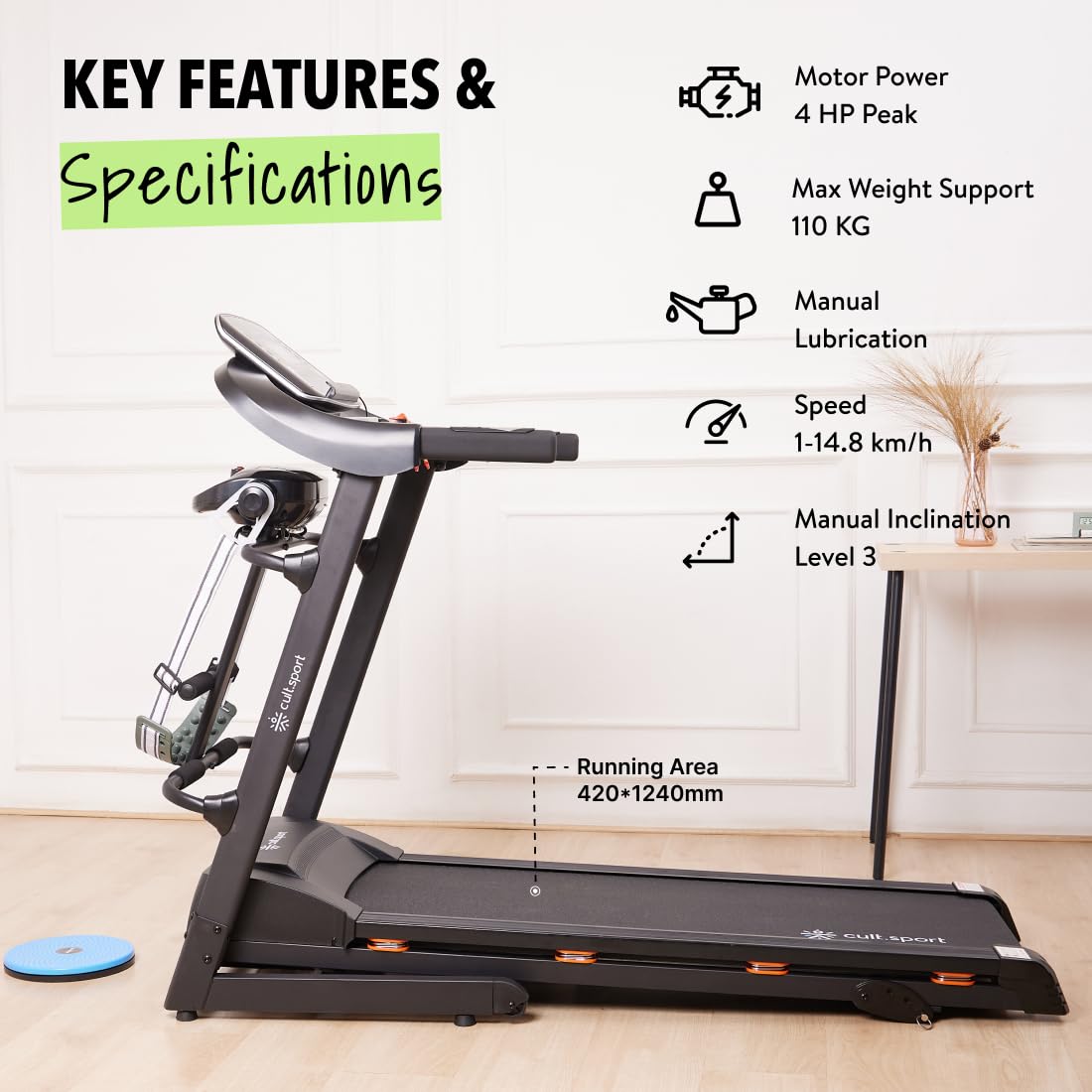 Motor Horsepower: 2 HP continuous and 4 HP Peak, Belt size: 1240×420 MM, Speed: 0.8-14.8 kilometer per hour, Max Weight support: 110 Kilogram, Recommended Weight Support: 90Kg, Lubrication: Manual.
