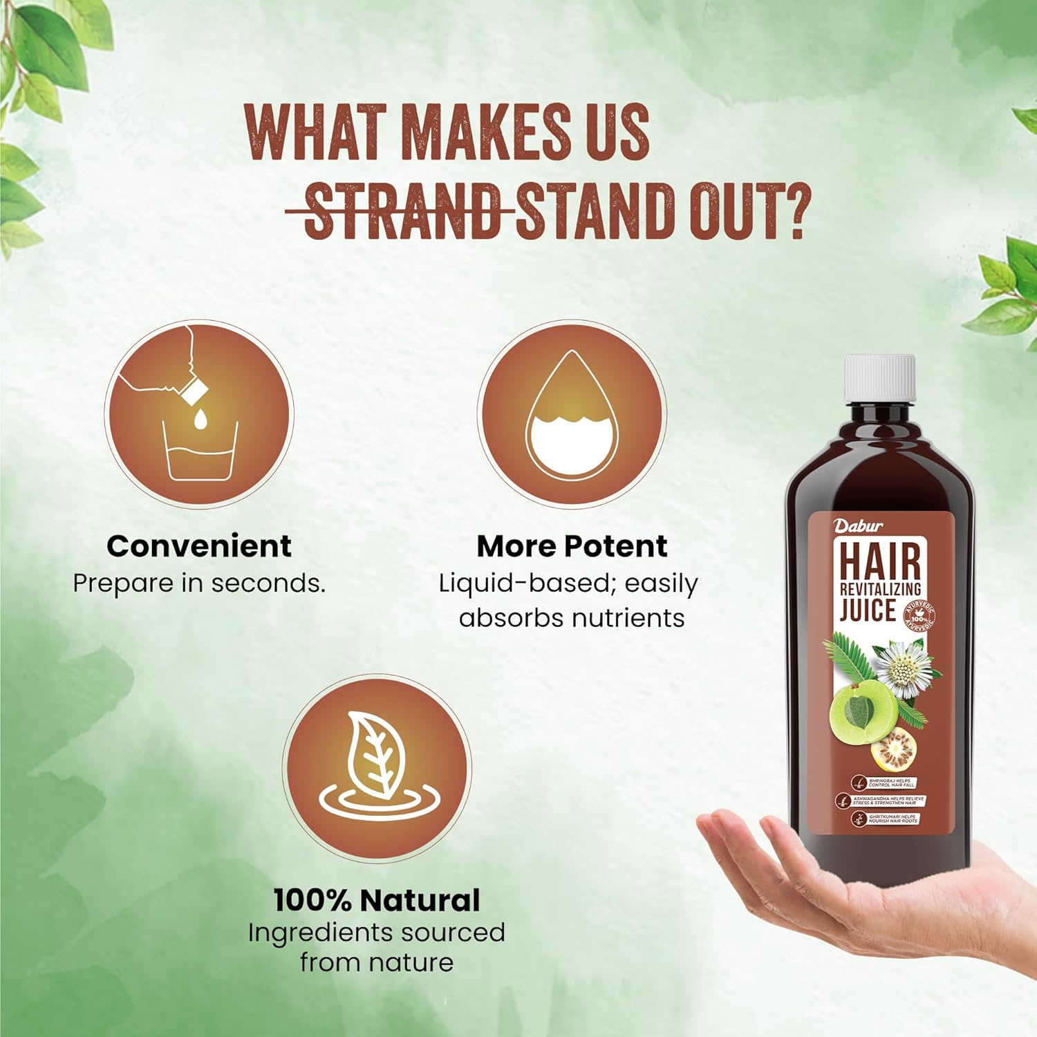 Our formulation contains a blend of 5 powerful ayurvedic ingredients with proven benefits for hair growth and nourishment, including Amla, Bhringraj, Aloe Vera, and Ashwagandha. Amla is rich in vitamin C, antioxidants, and ingredients that are essential for healthy hair roots and control of hair loss. Bhringraj promotes hair growth by stimulating the blood vessels in the scalp, while Aloe Vera soothes and moisturizes the scalp, promoting healthy hair growth. Ashwagandha is believed to improve blood circulation and reduce stress, which can contribute to hair fall control. All over the formulation helps rejuvenate hair, strengthening hair roots and boosts hair growth. Our Juice is made using only the highest quality ingredients and a unique production process to ensure optimal benifits. It is free from harmful chemicals, additives, making it completely suitable for daily use. The Juice is created by blending a carefully selection of herbs at precisely measured ratio using a water based concentration process. The procedure preserves the Phyto constituents content of the decoction. Our product helps you nourish hair from the root to tips with the healing power of proven herbs and ingredients, to give you beautiful healthy hair that shines. 1. From a bottle here comes a natural and effective way to achieve a healthy and radiant hairstyle. 2. There is more to good hair than you think. Not Just aesthetic, Healthy hair is also a sign of confidence.