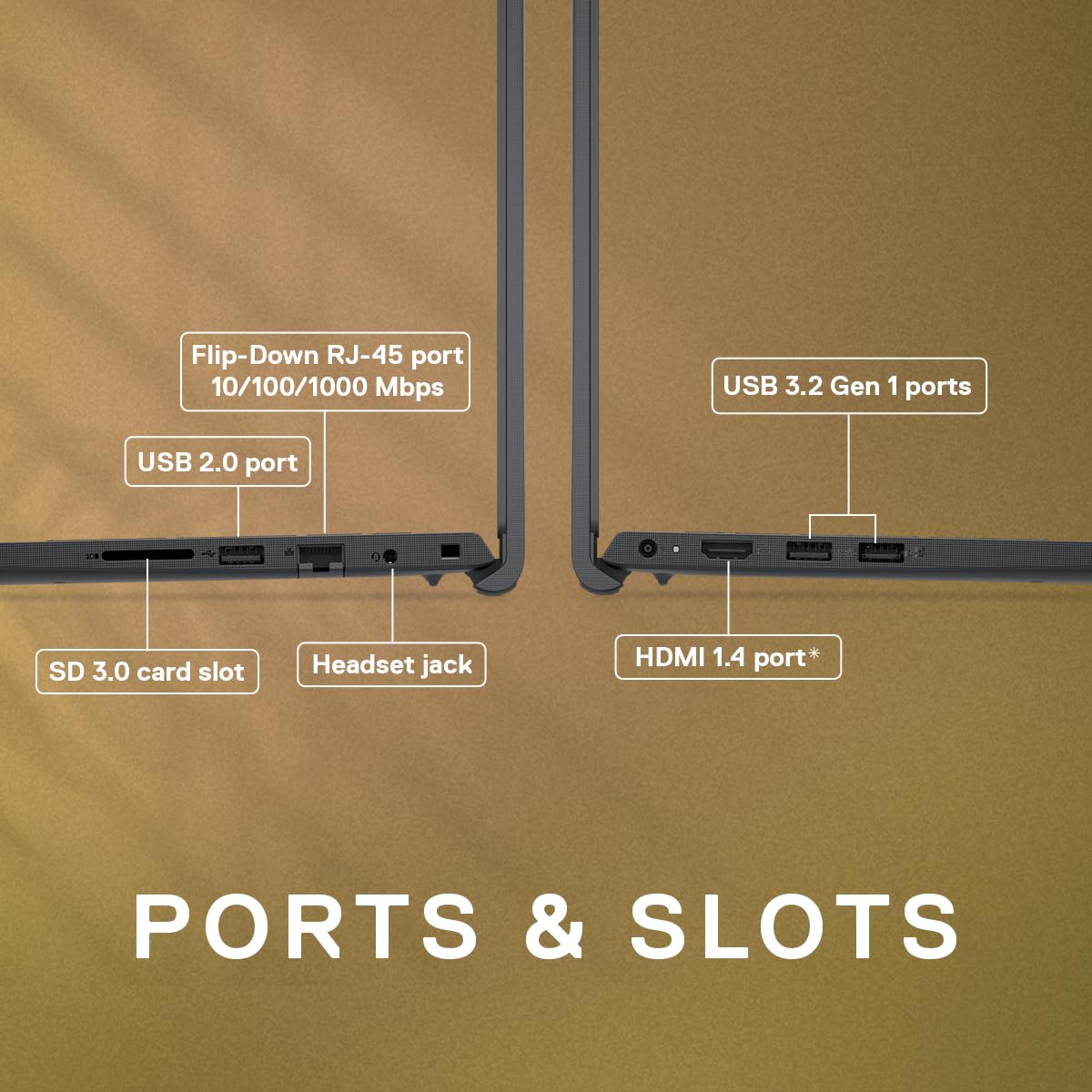 Ports: 2 USB 3.2 Gen 1 port, 1 USB 2.0 port, 1 headset (headphone and microphone combo) port, 1 HDMI 1.4 port, HDMI 1.4 (Maximum resolution supported over HDMI is 1920×1080 @60Hz. No 4K/2K output), 1 RJ45 Ethernet port (flip-down)
