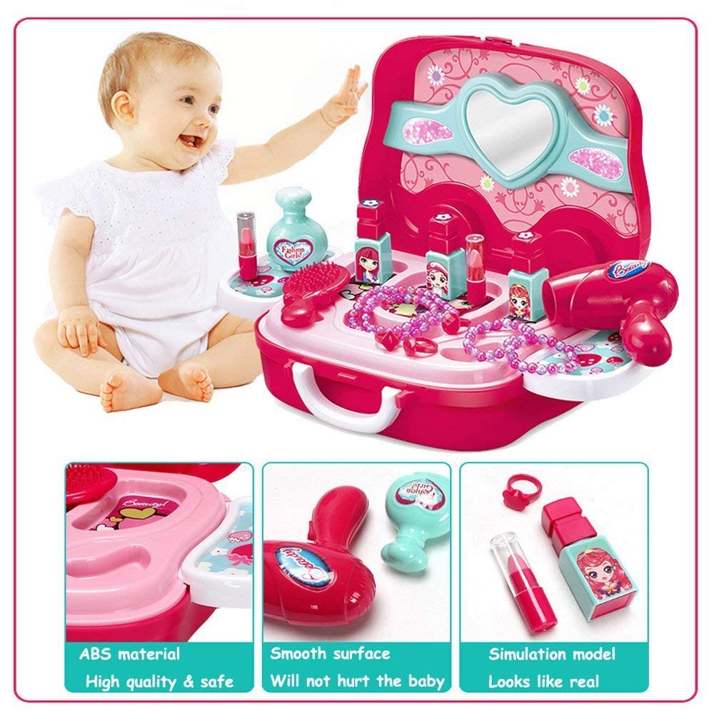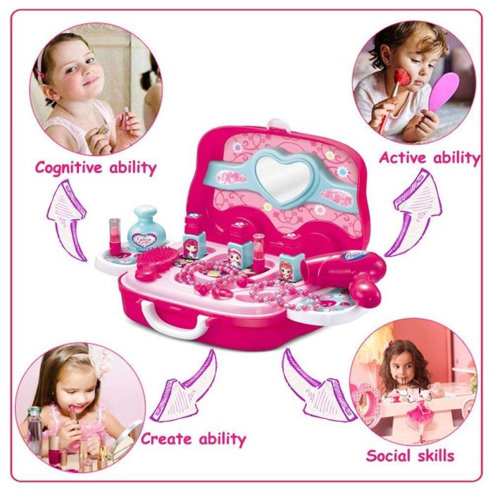 Develop Skills-Through role play game can develop baby’s creativity and Social skills. This beauty salon playset give children the first journey in discovering beauty