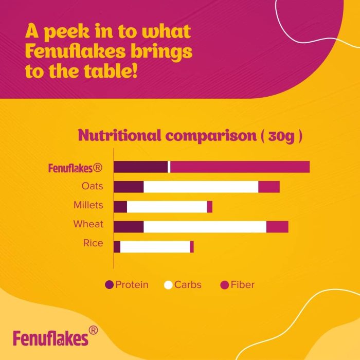 BENEFITS OF FENUFLAKES : Fiber helps improve digestion, promote satiety. Protein is essential for building and repairing tissues, maintaining muscle mass, and supporting healthy immune function.
