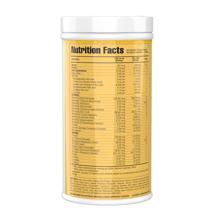 Proteins boost your metabolism: Fiber facilitates smooth digestion and also keeps your stomach full. It also has 9.35 gm protein – derived from pea, soy, and whey concentrate protein along with 3.6g fiber. Without providing a sugar overload, the slim shake is a unique blend of 12 healthy superfoods and 25 essential vitamins and minerals to take care of your daily nutrition quota.