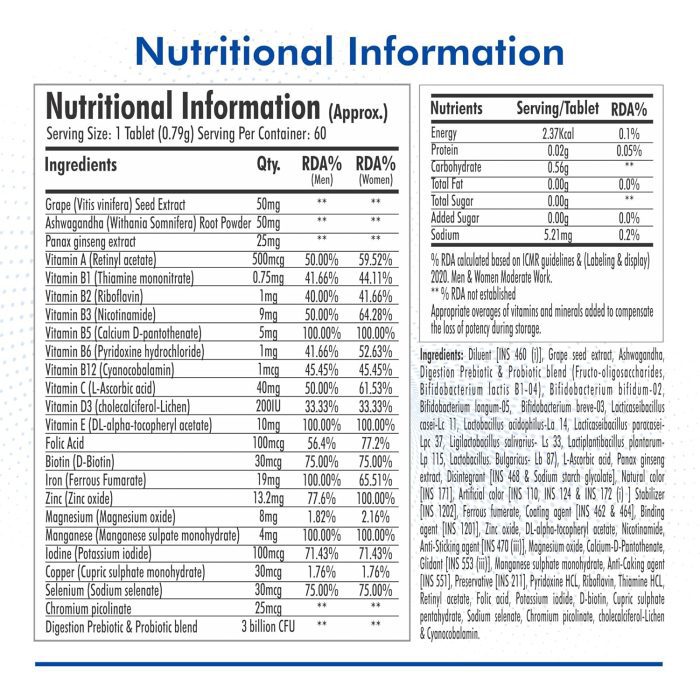 ENHANCES IMMUNITY & FOCUS: This multivitamin and multimineral tablets contain Ginseng that has antioxidant and anti-inflammatory properties. It supports the immune system to fight off infections. It also helps in improving focus, concentration & alertness.