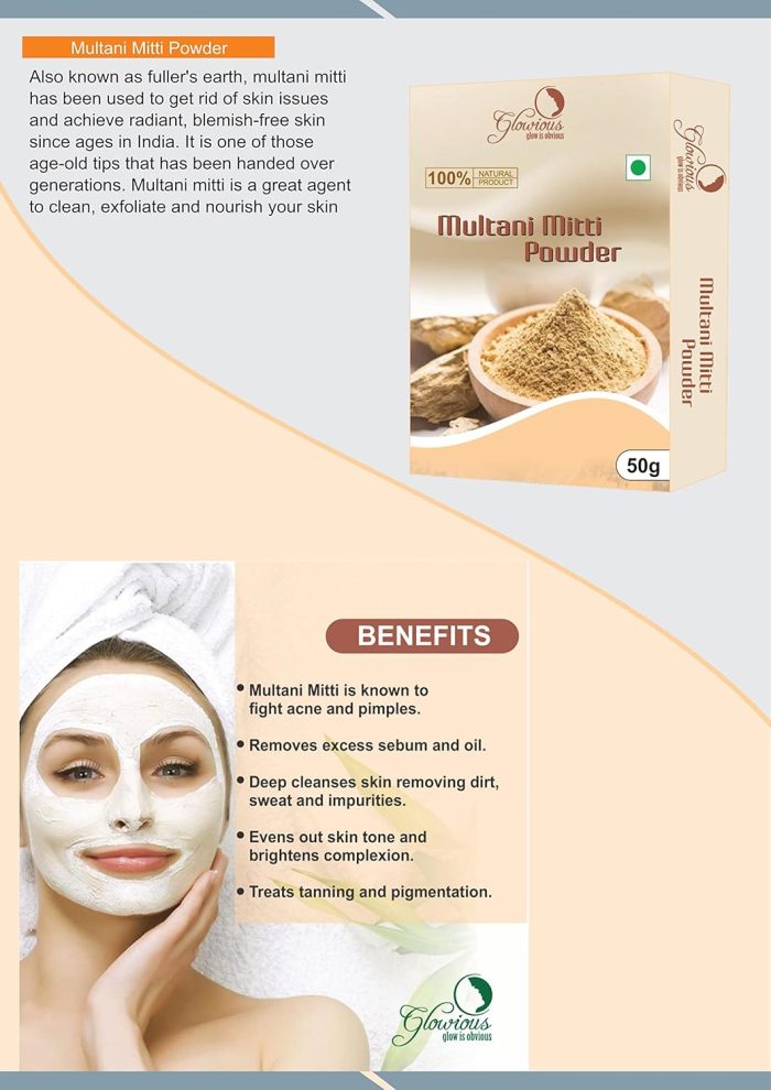 Achieve natural radiance with our Glowious Skincare Combo Pack, featuring Multani Mitti, Kasturi Turmeric, Lemon Peel, and Amla Powder in convenient 50g packs for a complete skincare ritual.”