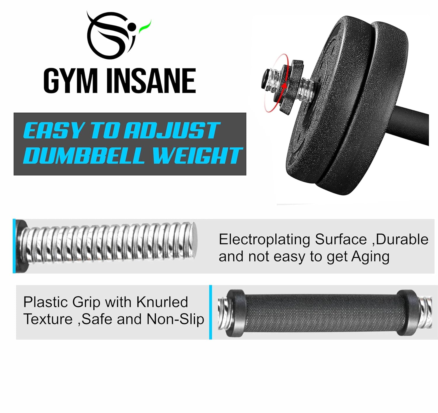 20 kg excersice equipment for home gym : 50 kg exercise equipment with good Quality PVC Material.gym weight plates strength training & weight lifting gym equipment for home gym workout 5 FEET STARIGHT ROD: 5 FEET Straight rod comes with two locks. 3 feet curl rod:Anti slip grip 3 feet barbell perfect for weight lifting strength training with lock . 14 “dumbbell Anti Slip ,Comfortable grip dumbbell set -comes with plastic nuts filled with concrete with deep threaded prevent slipping while workout Make in India. :This gym kit perfect for gym workout. Highly durable and long lasting Ideal for unisex. home gym equipment for men ,gym equipment for home work out.