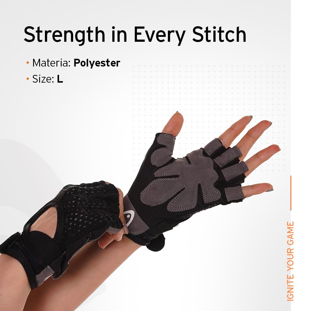 Elevate your workout experience with HEAD Fitness Gloves, meticulously engineered for comfort, grip, and durability. These half-finger gloves are designed for both men and women, offering exceptional performance during weightlifting, fitness training, cycling, and various outdoor activities. Crafted from high-quality, breathable polyester material, our gym gloves keep your hands cool and dry, reducing the risk of blisters and discomfort. The non-slip design ensures a secure grip, allowing you to confidently tackle weight training and multiple exercises. Featuring an adjustable strap and integrated wrist support, these gym hand gloves provide a snug, customized fit, while the durable construction guarantees long-lasting performance for all your exercise training needs. Experience the difference of HEAD’s commitment to quality and performance – your perfect gym accessories for women and men. Included in this set is one pair of blue HEAD Fitness Gloves, machine washable for your convenience.