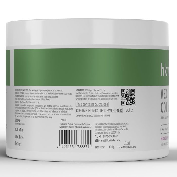 FOR YOUNG AND GLOWING SKIN: The initial signs of skin ageing are often the result of deeper changes – primarily your skin’s inability to renew itself due to the natural loss of collagen. hk vitals Skin Radiance Collagen Veg contains Vegetarian Collagen peptides which is clinically-proven to reduce fine lines and wrinkles in 8 weeks. It also has antioxidants like Vitamin C & E that help boost skin glow and radiance