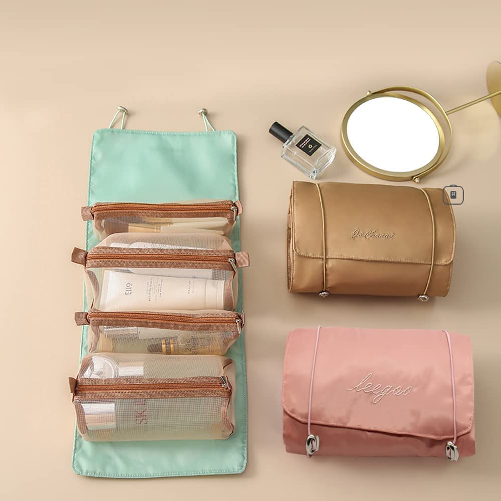 𝐂𝐮𝐬𝐭𝐨𝐦𝐢𝐳𝐚𝐛𝐥𝐞 𝐬𝐭𝐨𝐫𝐚𝐠𝐞 𝐬𝐨𝐥𝐮𝐭𝐢𝐨𝐧: The Rolling Makeup Pouch features four detachable mesh pouches with zip closures, allowing users to organize makeup items according to their preferences. Each pouch can be easily attached or removed from the main roll, providing flexibility for various storage needs.