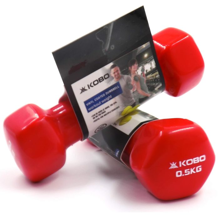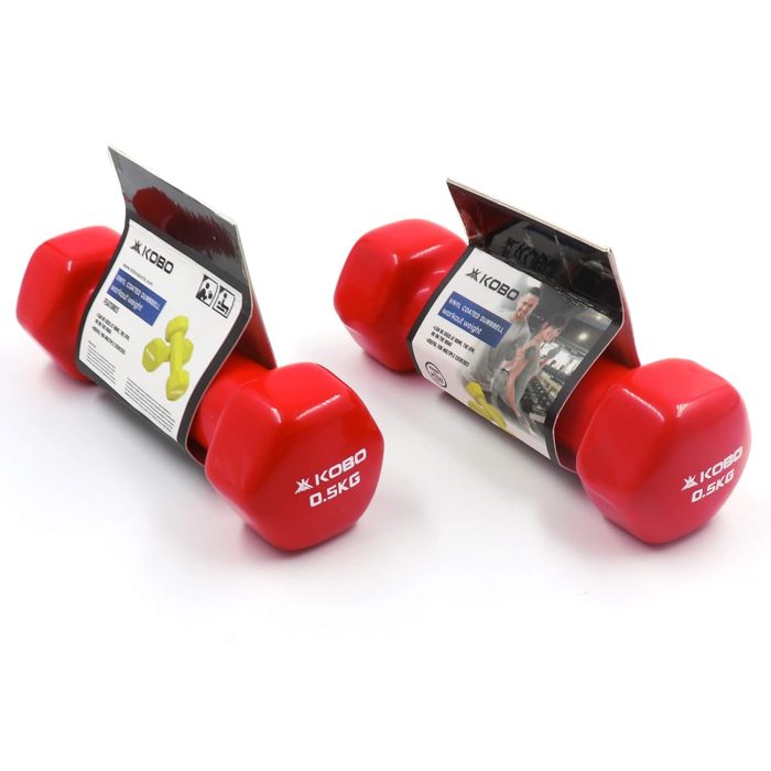 Kobo imported vinyl coated grippy dumbbell a. 1 pair dumbbells of 0.5 kg each (0.5 kg x 2 = 1 kg) accurate weight with variation not more than 5 percent. Cast iron dumbbell with colourful vinyl exterior coating for a strong, non-slip grip. Colour coded for easy identification and weight printed on dumbbells. Vinyl coating is easy on floors and helps to protect dumbbells from wear and tear over time. Hexagonal shape for easy stacking and roll-free use. Great for intensifying workouts such as walking, jogging, aerobics, cardio and more. Weights are built to a professional grade quality and designed for commercial gyms, clubs and home use. Contoured handles of this vinyl dumbbells are designed for easy and safe handling practice. Can be held in hands while walking to boost calorie-burning. Perfect addition to aerobics and step workouts. Length of dumbbell is 12 cm. Length of handle is 7 cm.