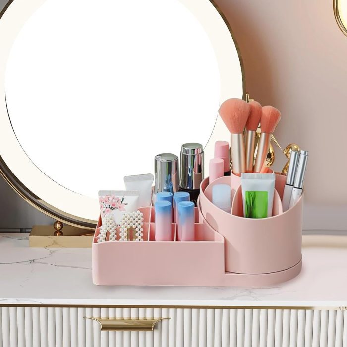 pink Makeup organizer with multi compartments,This desk caddy is crafted from thick ABS plastic, ensuring its strength and solidity for long-term use.This rotating makeup case can store not only cosmetics, but also small items such as clips, earrings, necklaces, and rubber bands, keeping your vanity organized and tidy.