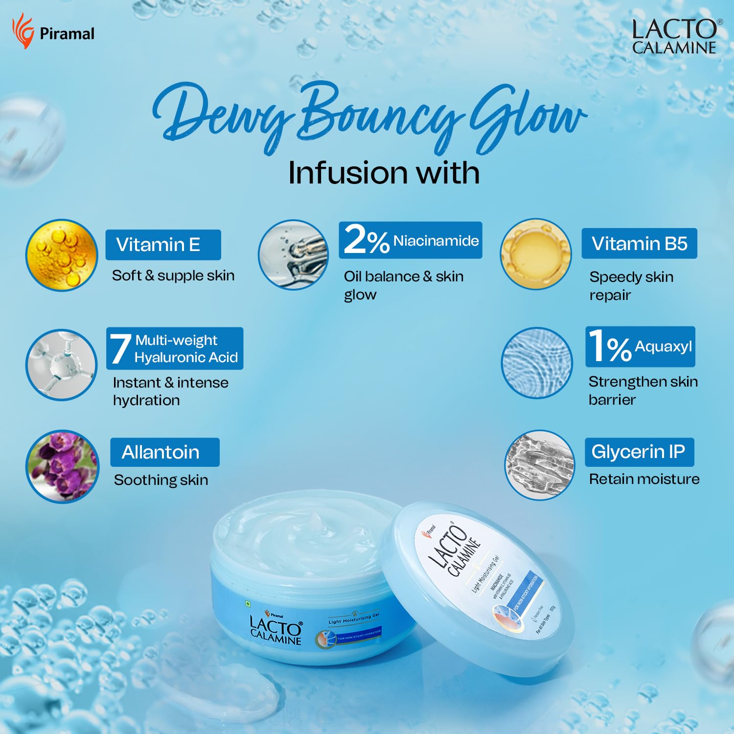 Vitamin E & Vitamin B5 helps in retaining skin moisture & enhances skin’s natural repair process. Vitamin E also has antioxidant properties that hydrates & soothes skin