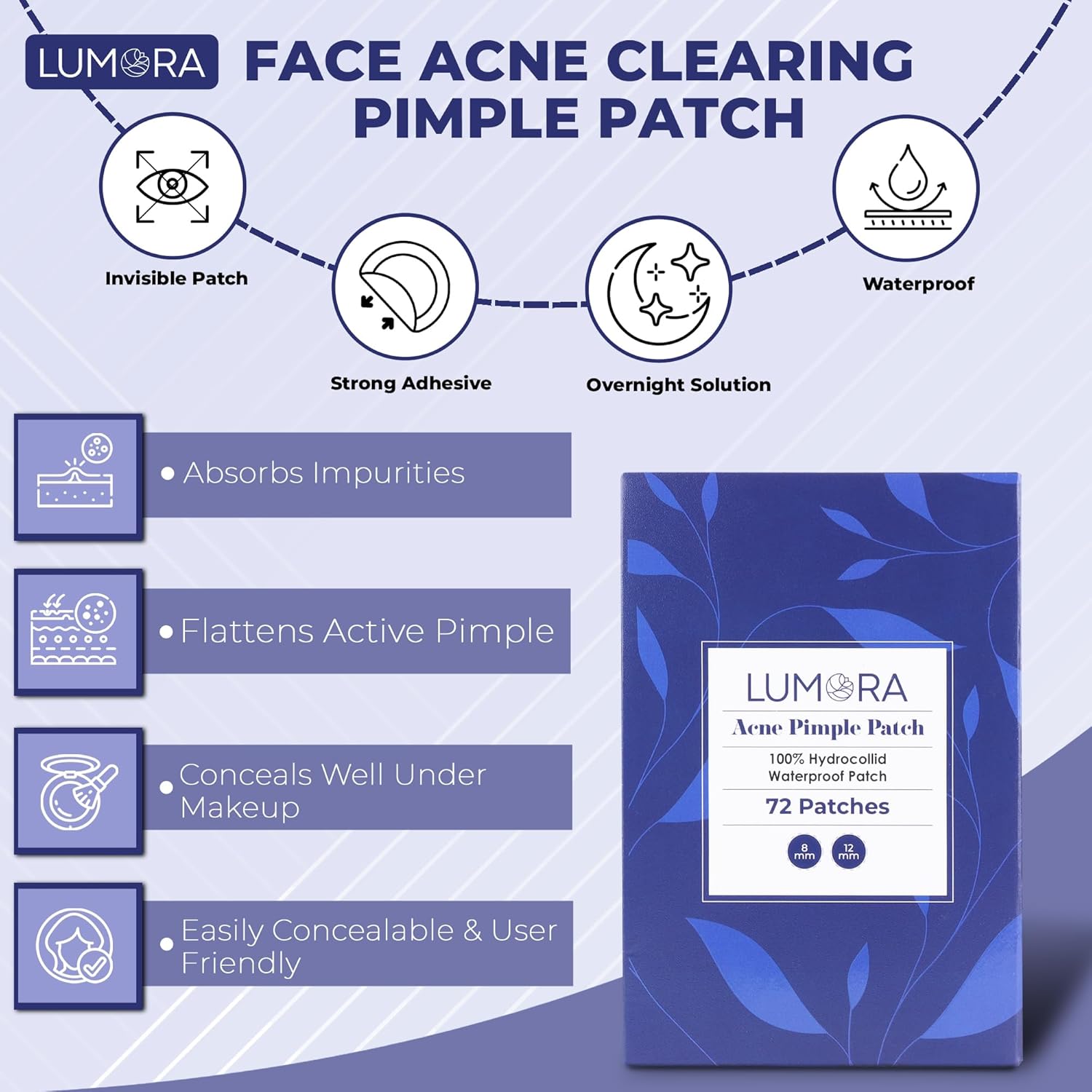 Advanced Pimple Patches for Face: Lumora acne patches are made from 100% hydrocolloid, a proven solution for absorbing pus, fluids, and dirt, aiding in faster healing. These pimple patches can be used daily, fitting seamlessly into your skincare routine.
