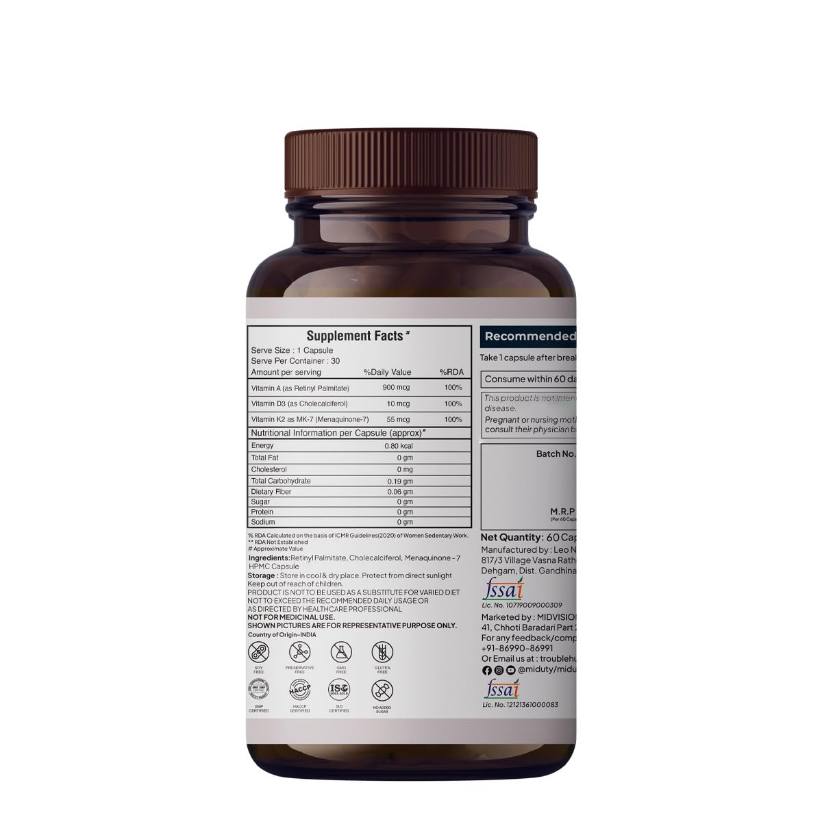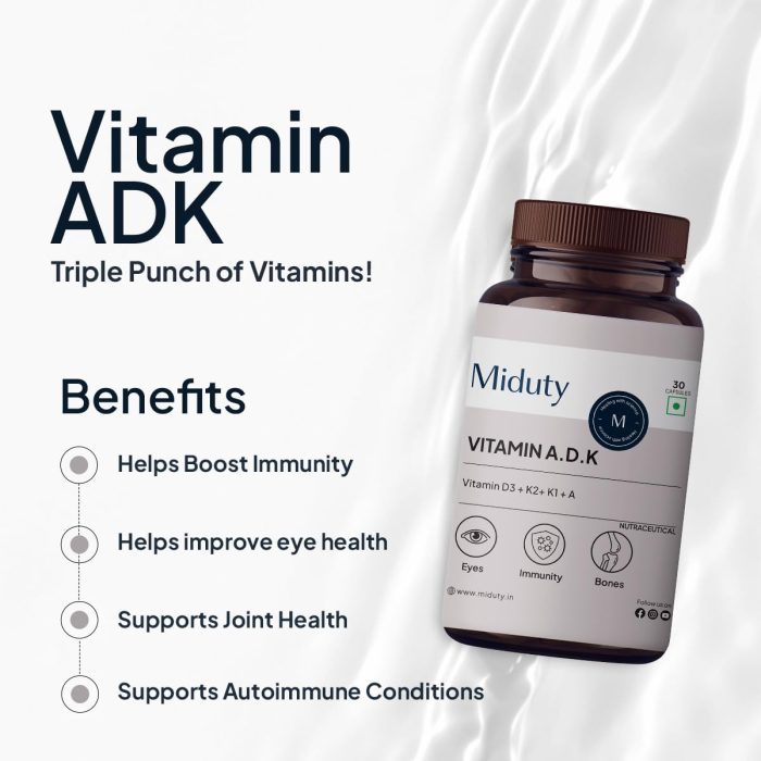 UNIQUE FORMULATION: Miduty’s Vitamin ADK has a unique formula which includes Vitamin A and Vitamin K2 with Vitamin D3 supplement. It makes it potent to manage the lower levels of respective vitamins in the body.