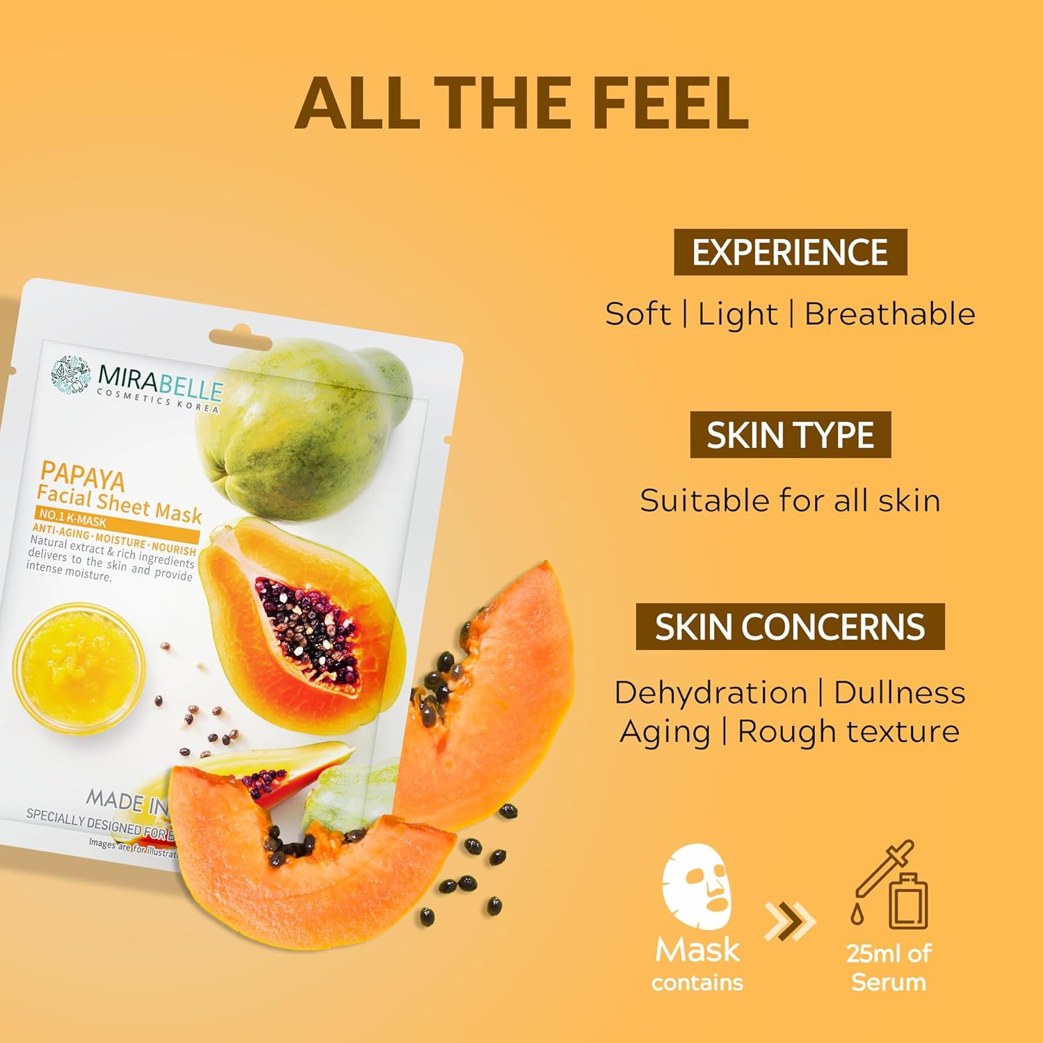 Mirabelle papaya facial sheet mask helps remove the hyperpigmentation on the face. It helps to reduce the wrinkles on the face. it also reduces under-eye black circles and tightens the pores, mainly it helps removes dead cells and enhances.