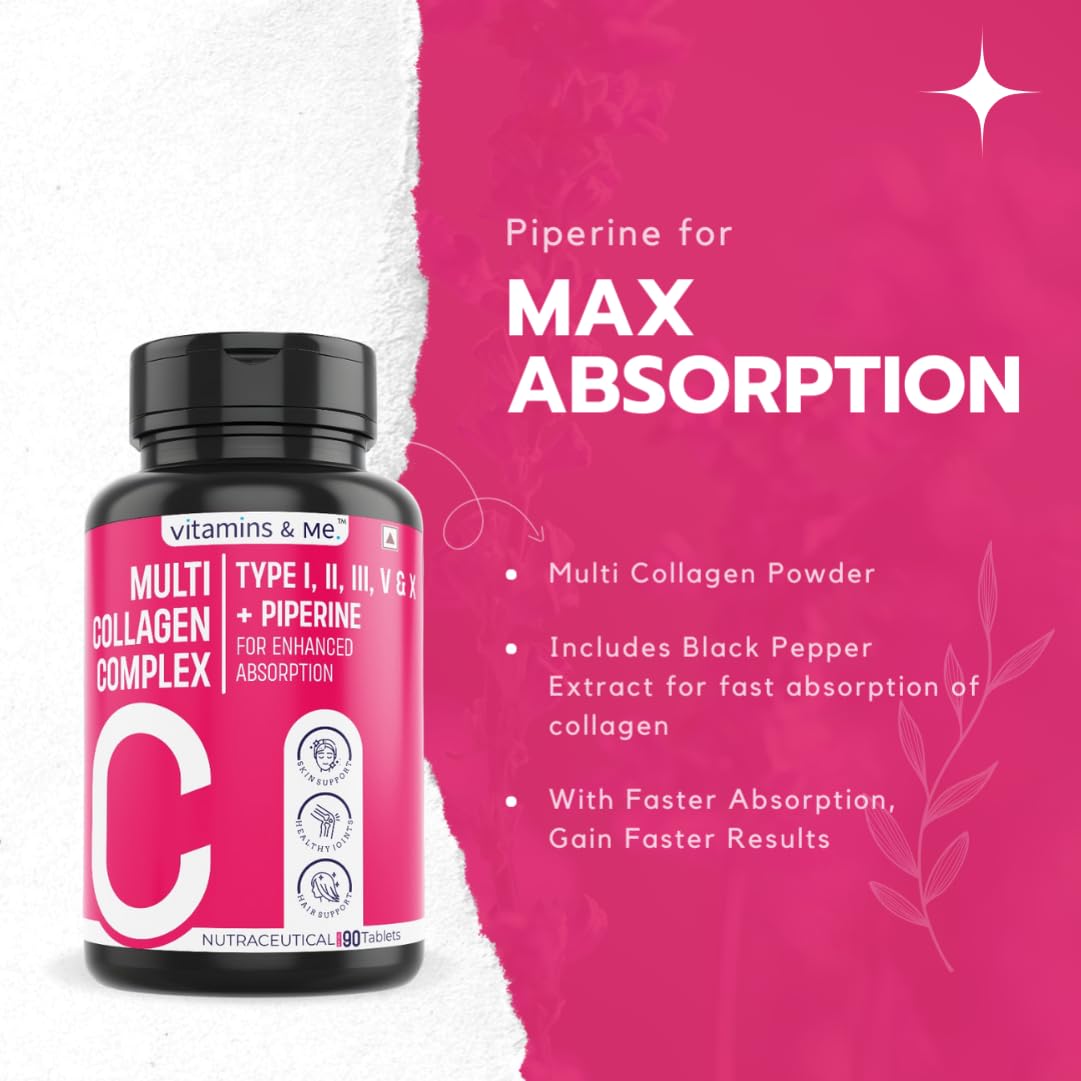 Comprehensive Collagen Blend: This supplement contains a multi-collagen complex with Type I, II, III, V and X collagen peptides for enhanced absorption.