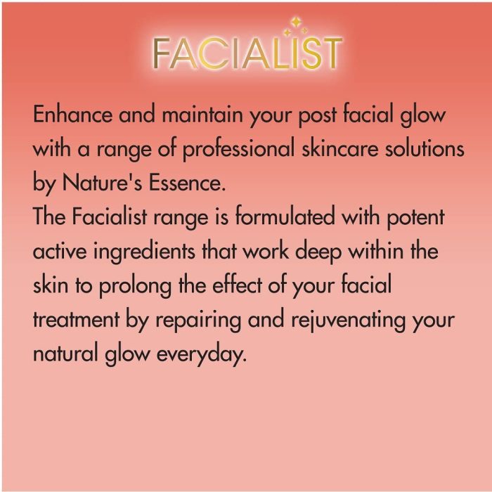 Enhance and maintain your post facial glow with a range of professional skincare solutions by Nature’s Essence. The facialist range is formulated with potent active ingredients that work deep within the skin to prolong the effect of your facial treatment by repairing and rejuvenating your natural glow everyday. Create your own personalised skincare ritual with a new expert range of serums and creams.