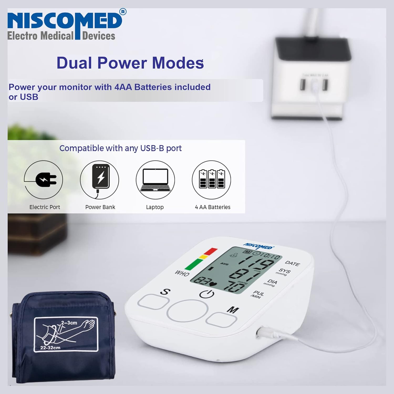 NISCOMED PW-222 BP meter features a USB port. Monitoring blood pressure is genuinely hassle-free with the help of the BP measuring device. If you ran out of the batteries, use the USB cable to measure the BP.