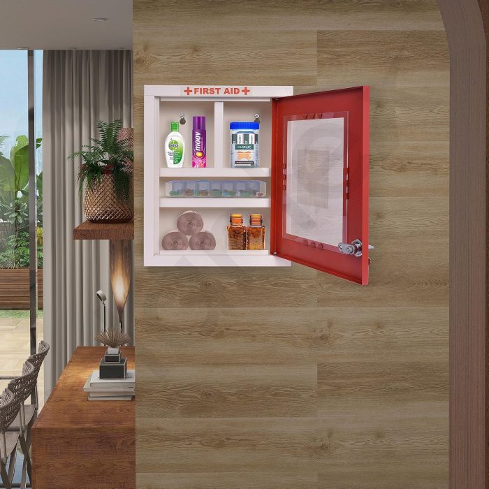 Made with front transparent acrylic glass and multi compartment 4-shelf for better organize of medicines with security lock on door for safety