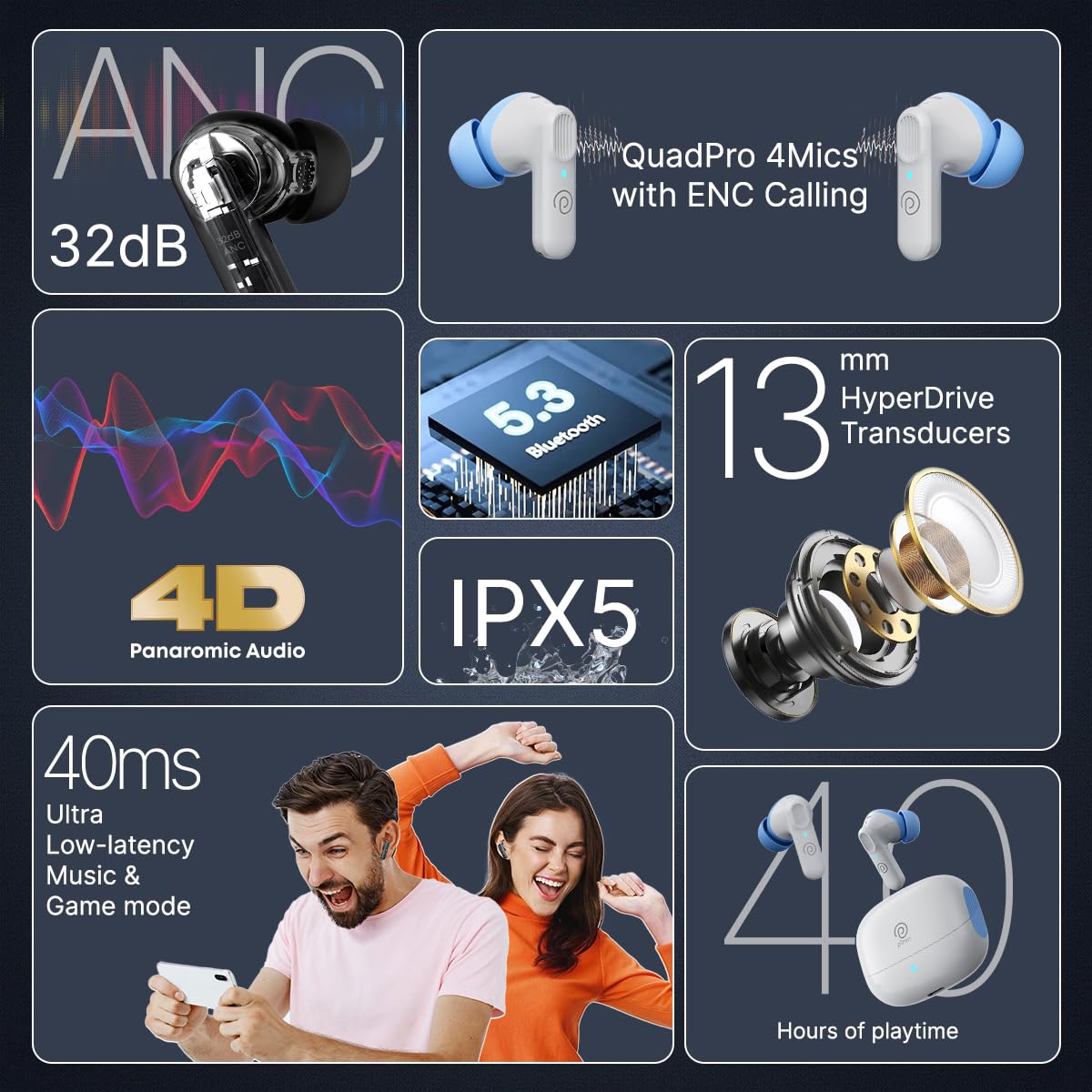 32db ANC & Quad Mic ENC: Zenbuds 1 v2 ANC earbuds cancel background noises up to 32dB for an immersive listening experience. 4 Mic with TruTalk ENC will enhance your voice clarity on calls by 3 times.