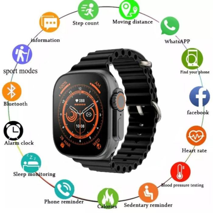 “Introducing the T900 Ultra Smartwatch, where cutting-edge technology meets sleek design. This advanced smartwatch is crafted to enhance your lifestyle with a multitude of features: – **Stylish Design**: With a modern and elegant look, the T900 Ultra seamlessly complements any outfit. – **Vibrant Display**: Enjoy a crisp, clear touchscreen display that provides easy access to all your apps and notifications. – **Health and Fitness Tracking**: Monitor your heart rate, track your steps, and keep an eye on your overall health with comprehensive fitness tracking capabilities. – **Multifunctional**: Stay connected on the go with call, message, and app notifications right on your wrist. – **Long Battery Life**: Designed to last, the T900 Ultra offers extended battery life so you can stay connected longer without frequent recharging. – **Customizable Interface**: Choose from a variety of watch faces and settings to suit your personal style and preferences. – **Water-Resistant**: With water resistance, the T900 Ultra is perfect for workouts and everyday wear, rain or shine. – **Compatibility**: Easily syncs with both iOS and Android devices, providing seamless integration with your smartphone. Elevate your everyday with the T900 Ultra Smartwatch, the ultimate companion for a connected and active lifestyle”