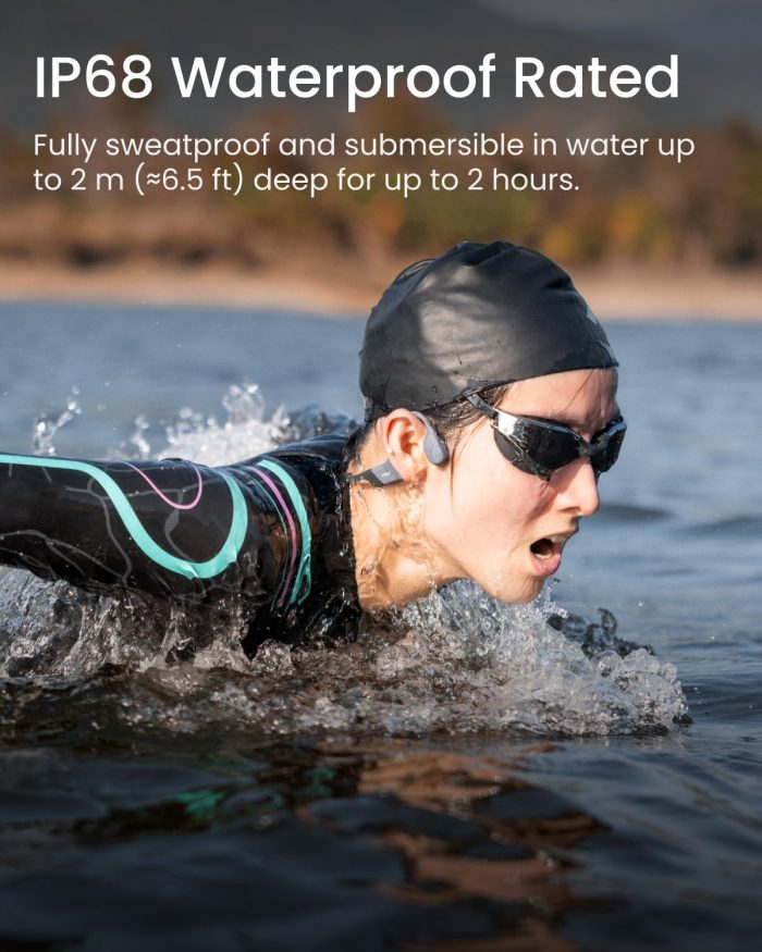 IP68 Waterproof Rating: Transition from water ventures to rugged terrains with OpenSwim Pro’s IP68 waterproof rating. Confidently take on depths of up to 2 metres for 2 hours, thanks to enhanced durability.