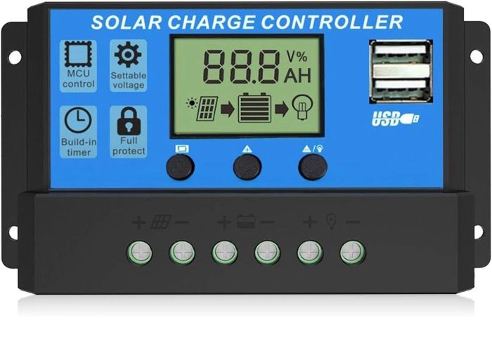 20A SOLAR CHARGE CONTROLLER: 20A Solar panel battery intelligent regulator certified, the solar controller compatibility with 12V 24V system. Discharge current: 10A, build-in industrial microcontroller, automatically manage the working of solar panel and battery in solar system. Dual USB output 5V/2.5A (max), to support mobile phone charging.