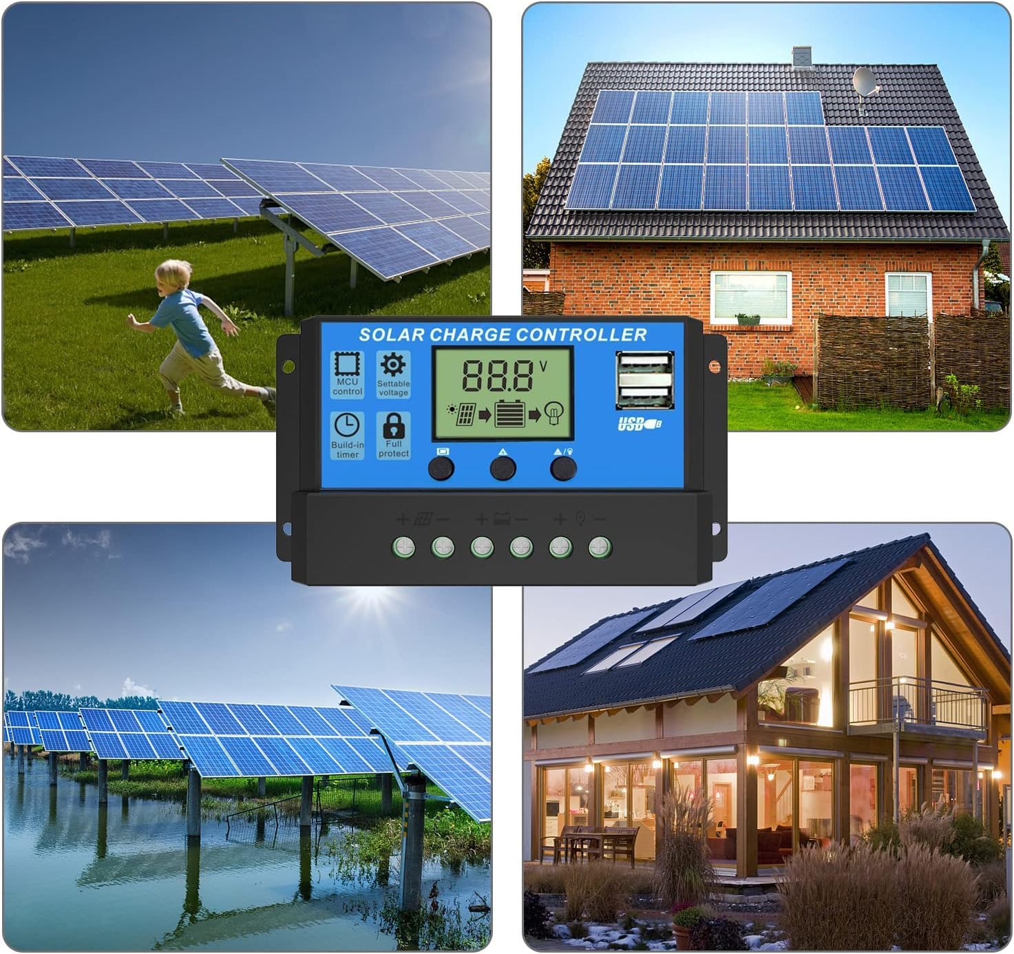 SIX PROTECTION FUNCTIONS: Solar controller 12v has Short-circuit protection, Overload protection, Over Current Protection, Overcharge protection, Under-voltage protection, Over-voltage protection. Fully 3-stage PWM charge management, improve system efficiency and prolong the life span of the battery.