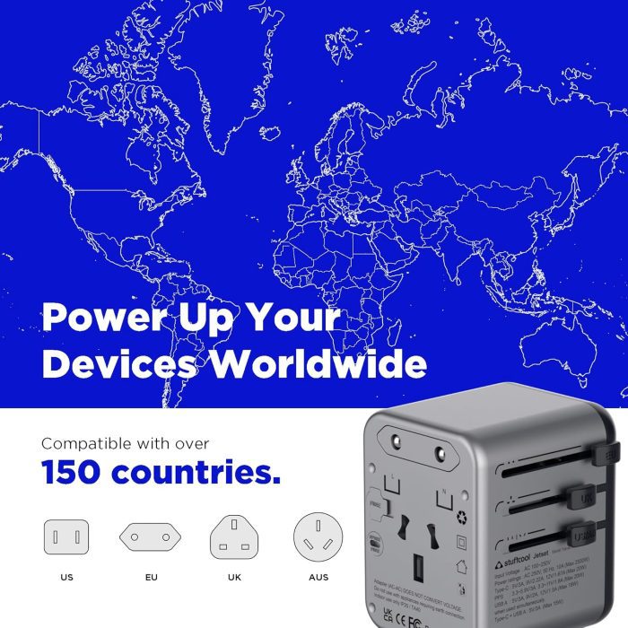 [Your Passport to Power Packed Adventures!]:Jetset Universal Travel Adapter offers compatibiliity with over 150 countries, featuring built-in plugs for EU, AUS, USA, and UK, ensuring seamless power access wherever your jouney takes you.