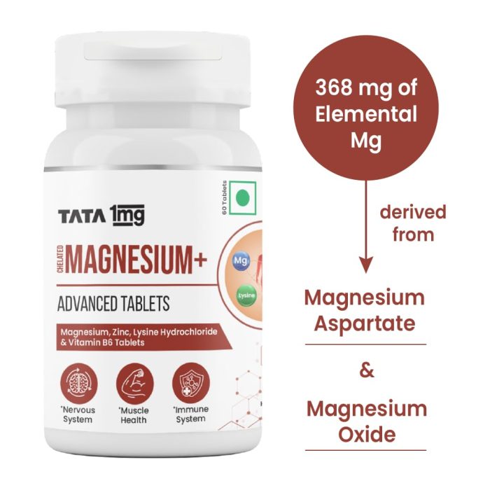368 MG OF ELEMENTAL MAGNESIUM: Tata 1mg Chelated Magnesium Plus Tablet contains 368 mg of elemental magnesium derived from Magnesium Oxide and Magnesium Aspartate which help in balancing the body’s magnesium levels. It also assists in carbohydrate, amino acid, and fat metabolism.