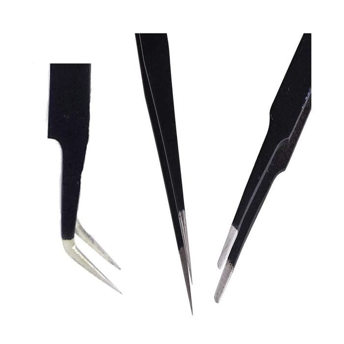 adda Bai Set of 3 ESD Safe Black Coated Pointed , Curved and blunt Tip Tweezers With 1 Metal and 4 Triangle Plastic Openers for Opening .