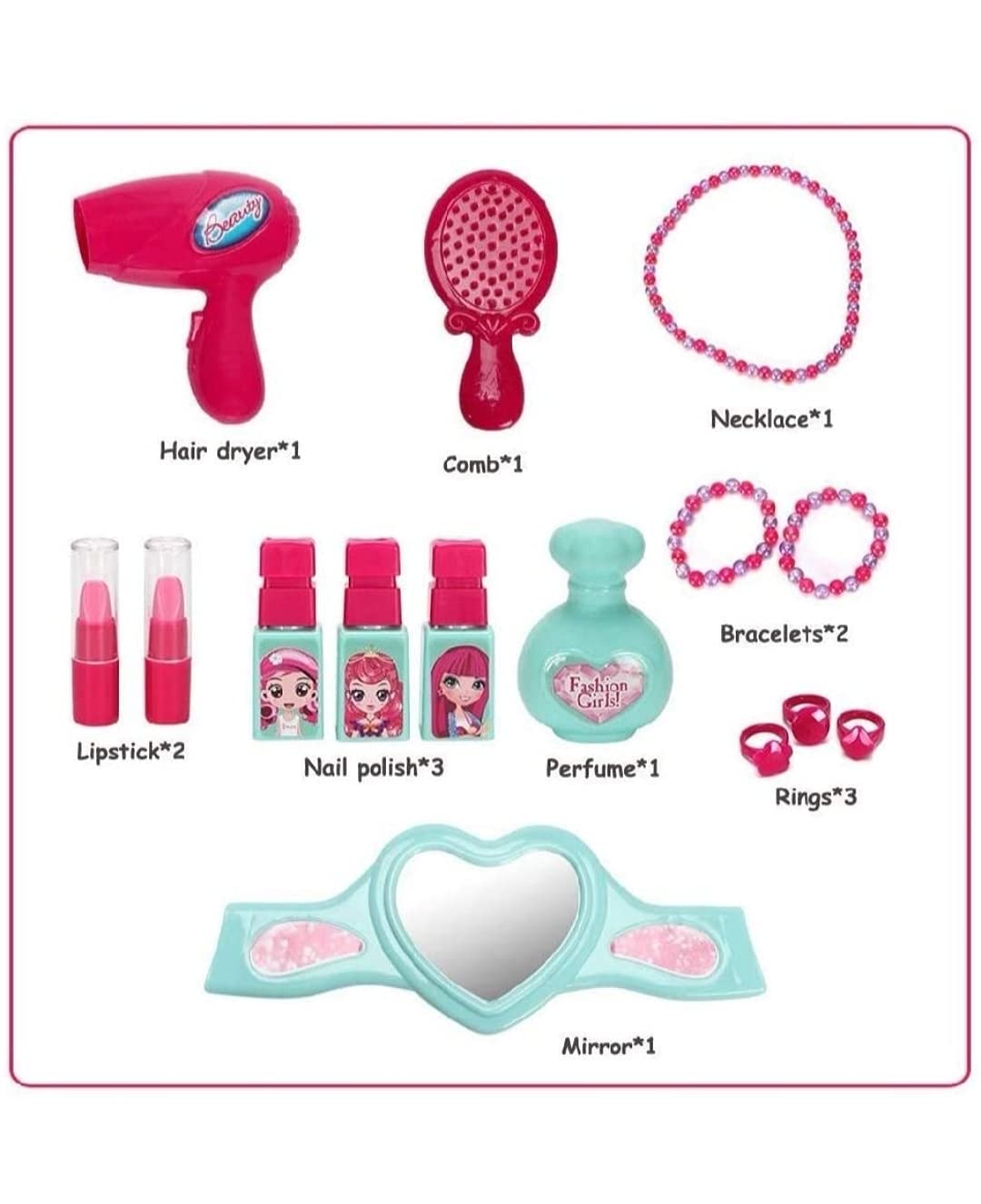 FASHION MAKEUP KIT FOR KIDS INCLUDES. Shatterproof plastic mirror, pearl bracelets and necklace, rings, hair dryer, lip gloss, lipsticks, perfume, nail polishes, hair comb and a sticker to decorate the make up kit. THIS IS NOT REAL MAKEUP AND DOES NOT APPLY TO SKIN.