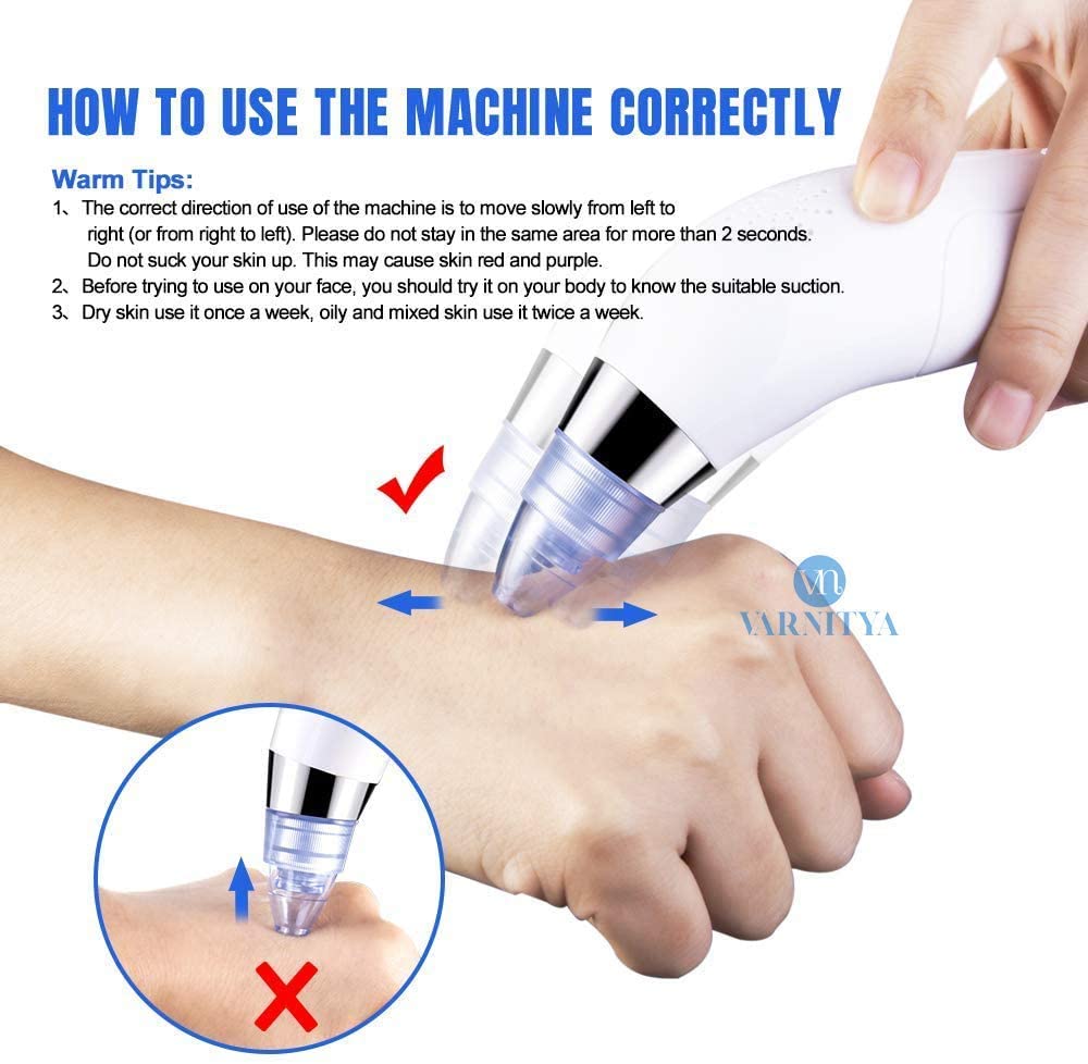 Steam Use a steamer or hot tower on your face for 3-5 minutes to open pores. Please apply with the blackhead reduce liquid if needed.It will help you more to remove the blackheads easily. Use Blackhead Remover Press the power button and choose the intensity level of the suction. We recommend starting with the tests on your hand before choosing a small probe with level 1-2, which is better for sensitive skin Note: Please don’t stay in one place more than 3 seconds, the whole process is not recommended for more than 5 minutes Wash Face Remove the blackheads and cleanse your face to make sure the blackhead is washed out sufficiently Note: Do not use scrubs or other cleaning products before and after care. Mask After use, use a firming mask or emulsion to shrink pores.