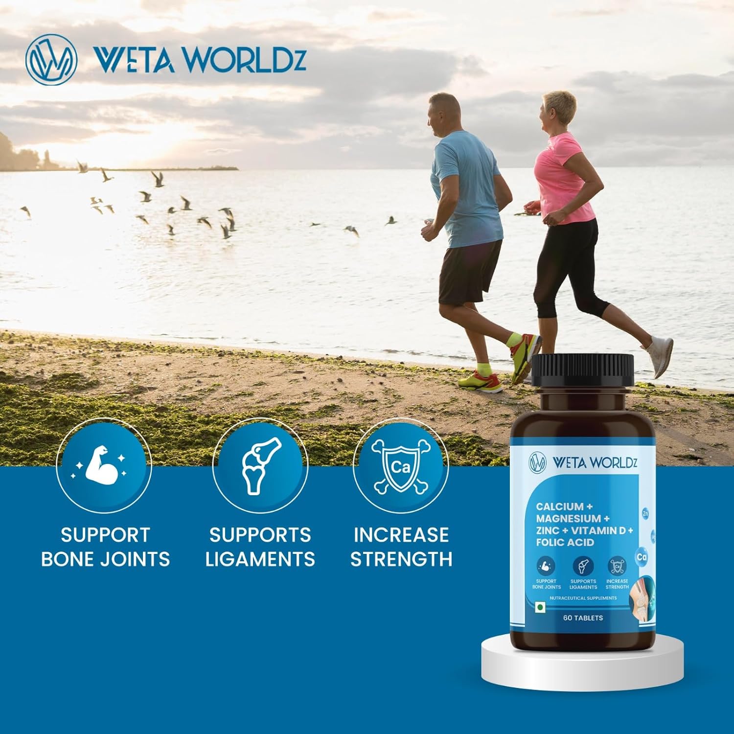 Weta Worldz (60 Tab) Calcium, Magnesium, Folic Acid, Vitamin D3 & Vitamin B12 is scientifically formulated by our team of Doctors and will exactly work for your Joints, Cartilage, Ligaments, Synovial Fluids & Bones especially crafted table has its own beauty that it is smallest in size to swallow easily without any hesitation, CCM has its own unique properties like reduces the risk of fracture, slow bone loss, maintain bone mass. MAGNESIUM benefits are energy creation, protein formation, nervous system regulations, muscle movements, increase exercise performance, maintaining sugar levels, maintaining heart health, anti-inflammatory benefits, and reduce anxiety. benefits of this tablet are increased immunity & metabolism. FOLIC ACID’s major benefits are cell growth & blood cell formation. VITAMIN D3 helps in calcium absorption so it will make your bone stronger, and reduces the risk of osteomalacia & osteoporosis, VITAMIN B12 is termed a building block of neuron and helps in the proper functioning neurological function