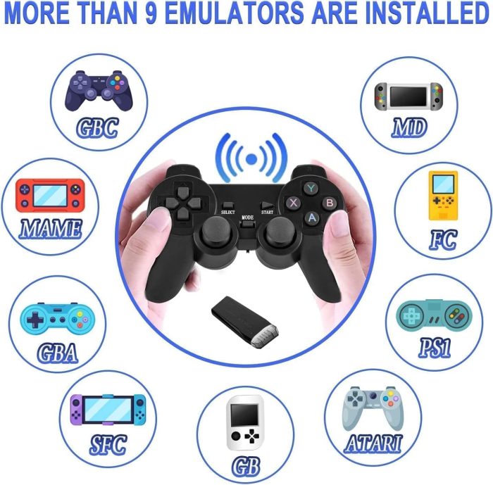 【Upgrated -Smart Game Chip】: wireless TV game console built-in more than 15000+ Games,more than 9 Emulators are installed , and a 64GBTF card is attached which support you to game search functions, and can save/read game records.Use upgraded game chips to support 8-bit, 16-bit, 32-bit, 64-bit, 128-bit emulators. It perfectly meets your needs for image quality and game fluenc